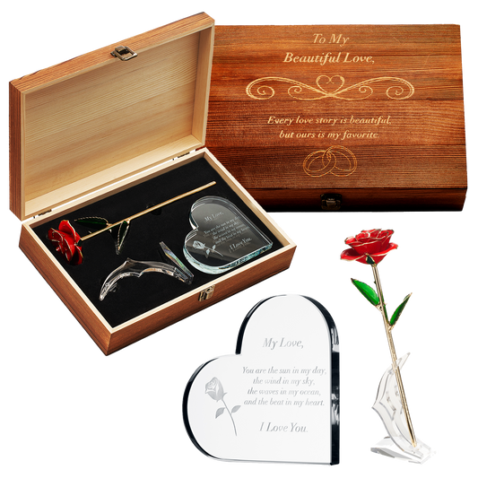 Anniversary, Birthday & Everyday 24K Gold Rose Love Box for Wife, Her, Women - Engraved Wooden Set 'To My Beautiful Love' Inscription, Includes Crystal Heart - For Birthday 1st Anniversaries