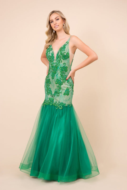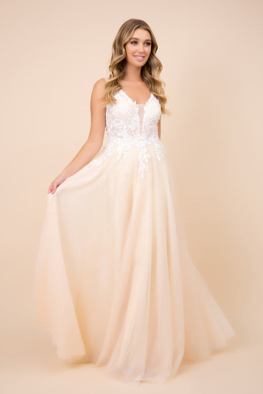 Tulle Skirt Embroidered Lace Open Criss Cross Back Long Prom Dress NXC1113