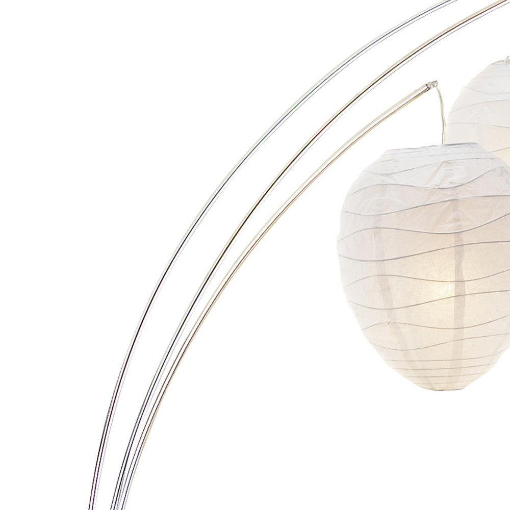 The Zen-inspired arc lamp can create a relaxing environment for the living room. White beehive shaped rice paper lanterns are suspended from curved chrome poles creating a warm, ambient glow that lights up a sectional area or living space. A rotary switch on the pole turns the lamp on and off. This lamp is smart outlet compatible. Bulbs are not included.