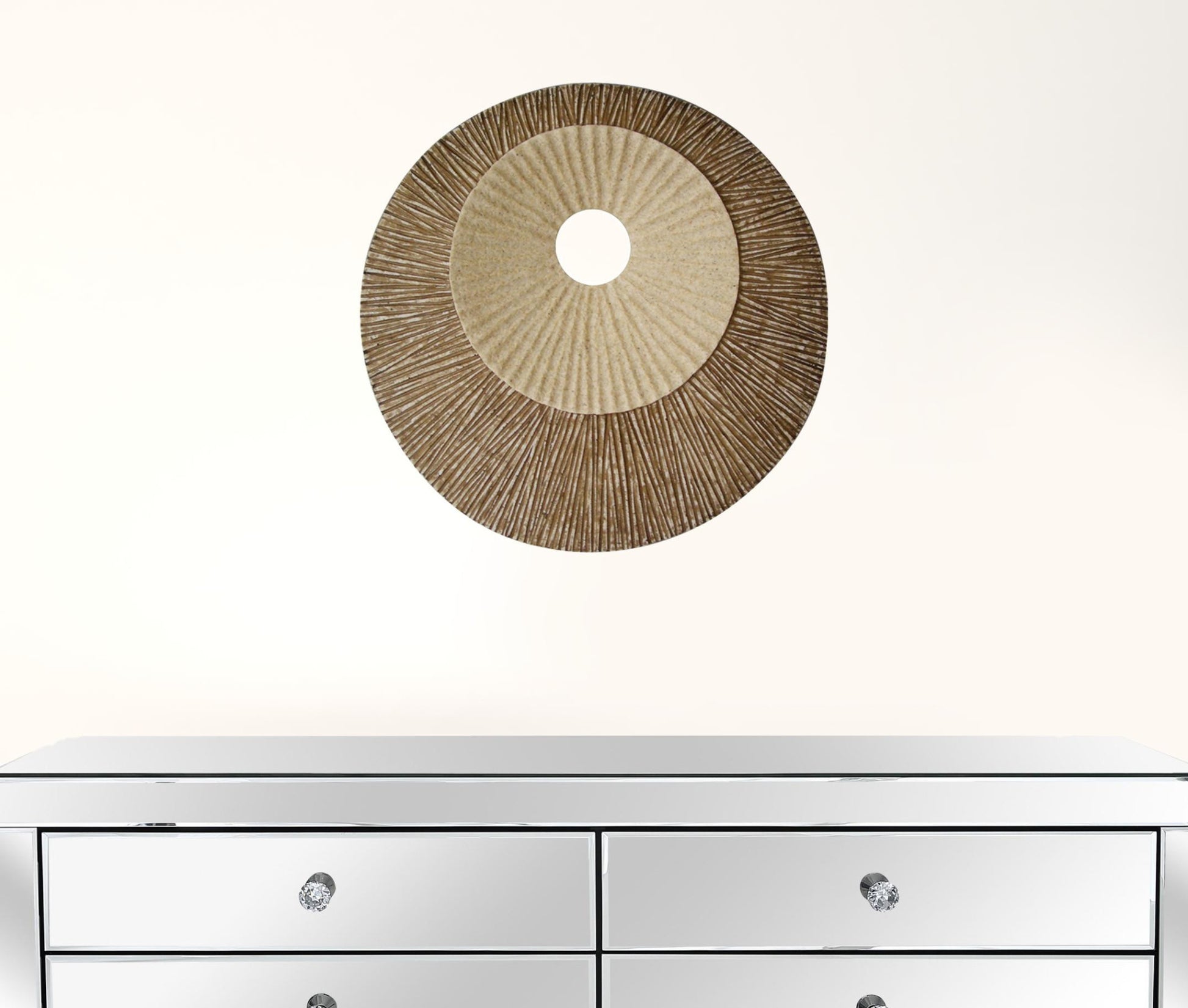 featuring simple spiral modern and contemporary design, our round double layer wall plaque will put a tantalizing visual effect on your entire home setting. it comes in a sand color circle design complemented with ribbed finish meant to seamlessly blend with existing decor in your home. this is a part of our wall art collection that is perfectly crafted to aesthetically wow you and your guests for many years to come. round double layer ribbed wall plaque 14" X 14" X 2"