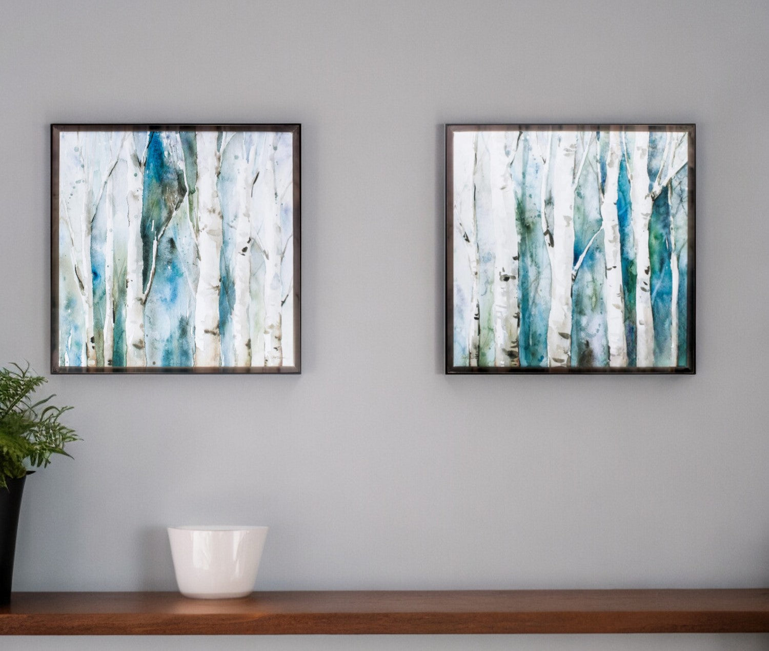 This set of two 22-inch blue abstract river birch brown framed wall art will add a beautiful decorative accent to your decor. Adding this set to your space to make your room feel more finished and attractive. Display them together or separate in different rooms. Features a modern and abstract design that is peaceful, calming, and unique. Utilize this opportunity to create a focal point in the room with this fabulous wall decor option. 22-inch H x 22-inch W x 3-inch D