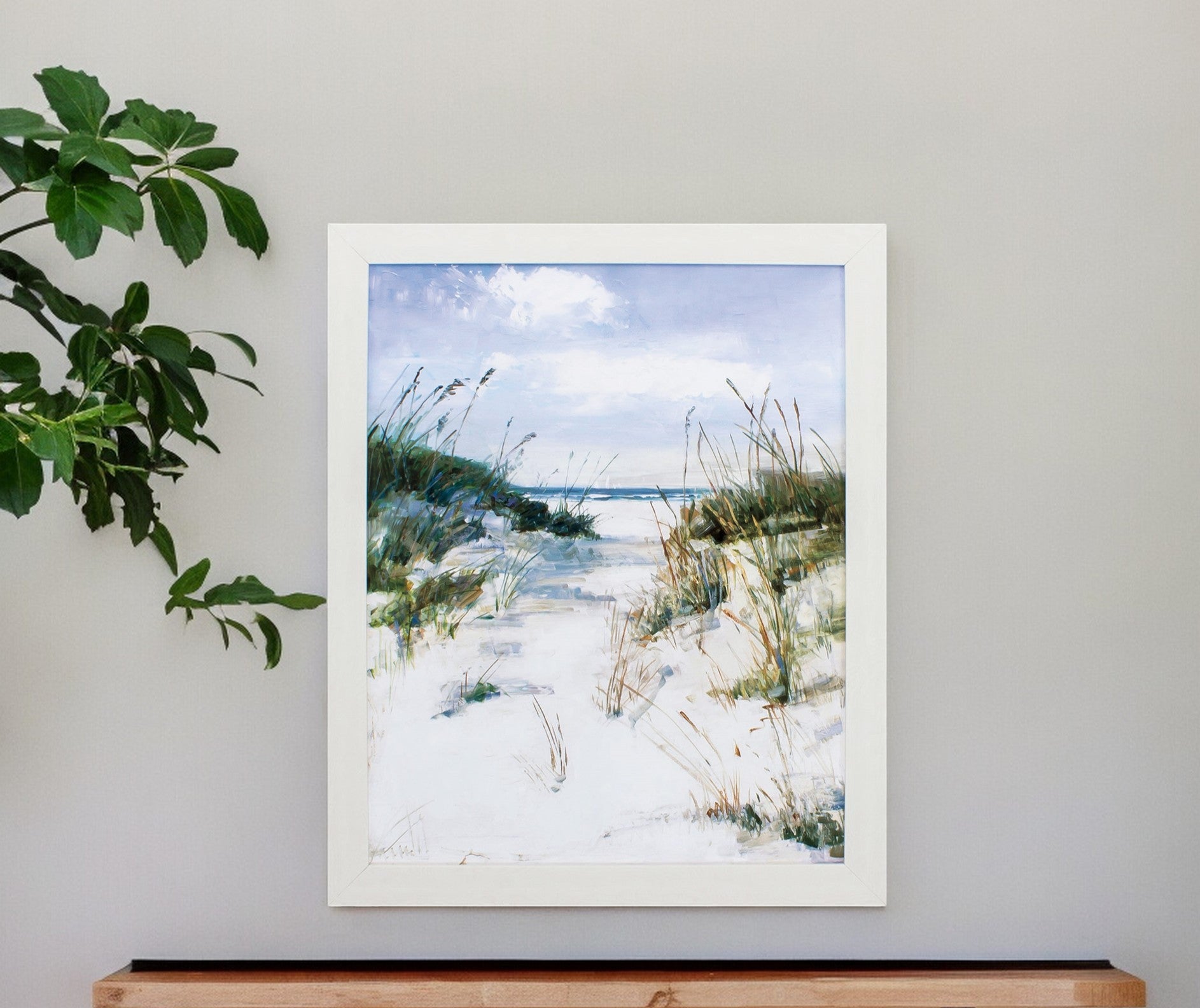 This 31-inch x 25-inch white ocean dunes framed wall decor will add a beautiful decorative accent to your decor. Instantly liven up your space with this art that brings color and dimension to your walls. Bring a little bit of the beach into your space when you decorate with this good looking art. Hang on your wall to add some up to date fashion and decoration. Utilize this opportunity to create a focal point in the room with this fabulous wall decor option. 31-inch H x 25-inch W x 1-inch D