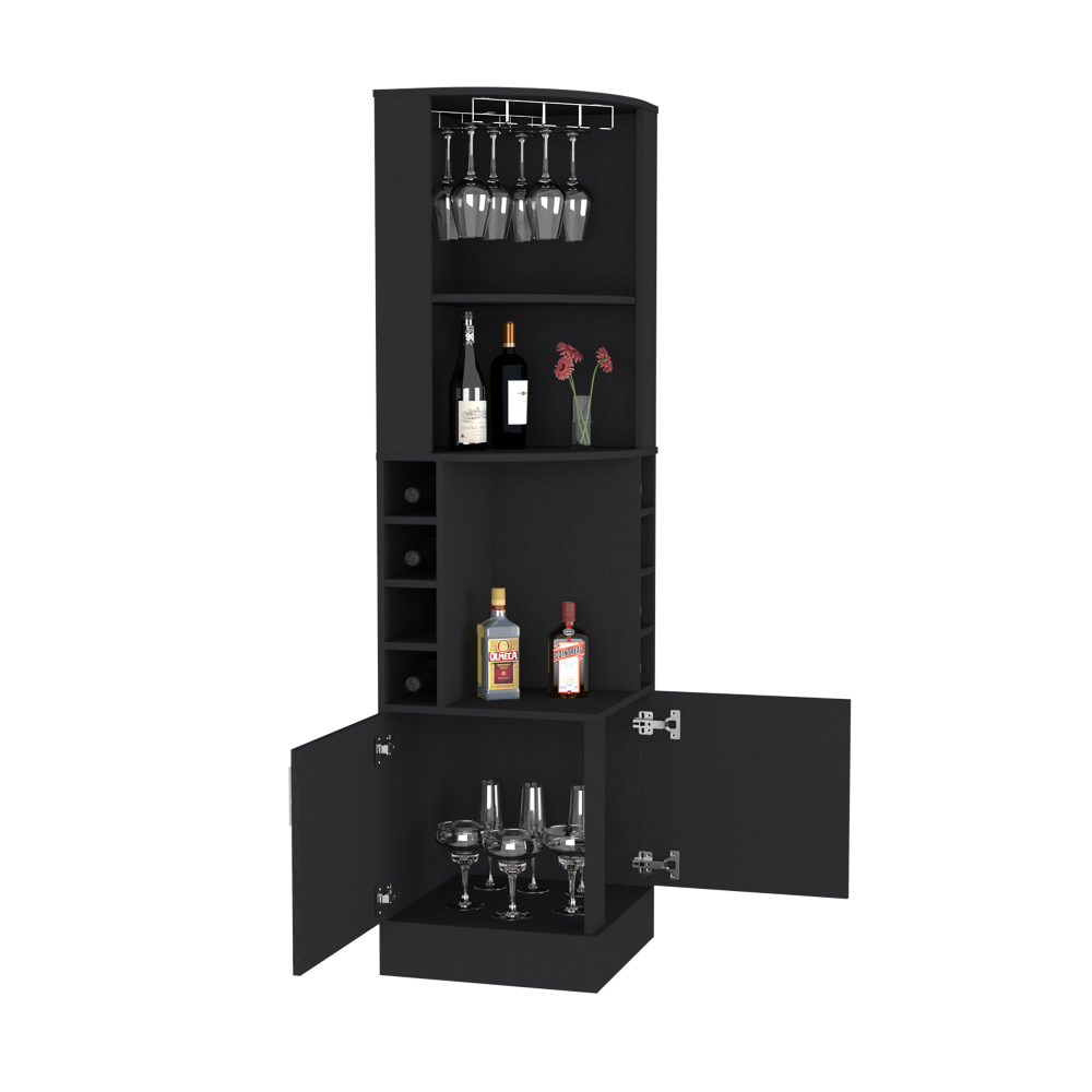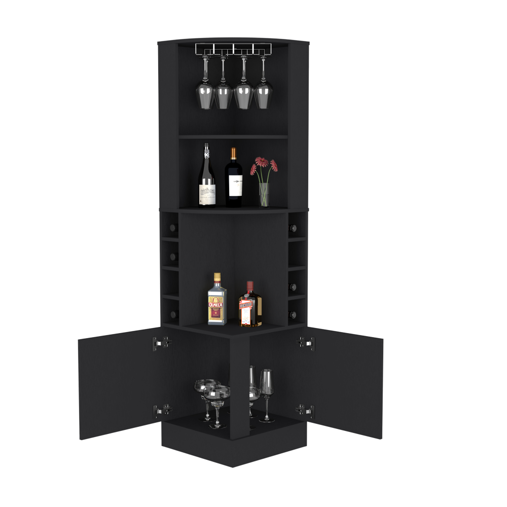 Corner Bar Cabinet Atanasio, 8 Wine Cubbies, Double Door, Black Wengue Finish