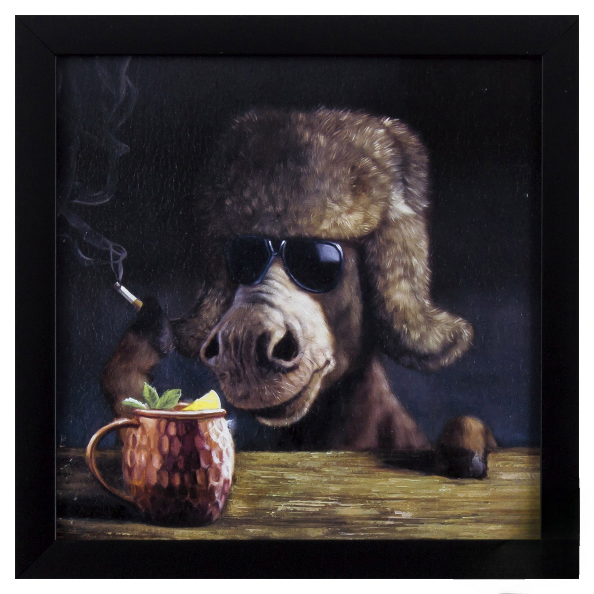 Fun and funky, this Cool Moscow Mule Framed Art Framed Art will make you laugh out loud. In a black frame, this acrylic artwork without glass is textured, making it not only hilarious but unique. The latest craze at the bars, the Moscow Mule, is about to be enjoyed by this too cool for school mule. Make sure you book for your favorite pooch. 11" x 11" x 1" "