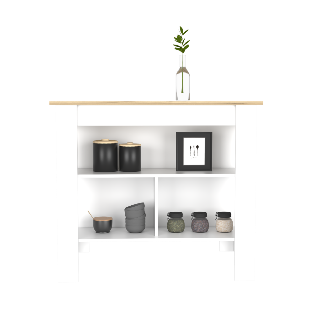 The Dozza Kitchen Island brings style and functionality to your kitchen space. The large tabletop provides an open work area/display shelf. Below the tabletop, you will find one side with two shelves for additional storage space (12 In Height x 12 in Deep x 38 in Lenght). The bottom shelf is split into two equal sections, all of which are perfect for displaying any decor, pots, pans, or kitchen utensils handy when you need them, designed in elegant White & Light oak manufactured wood.