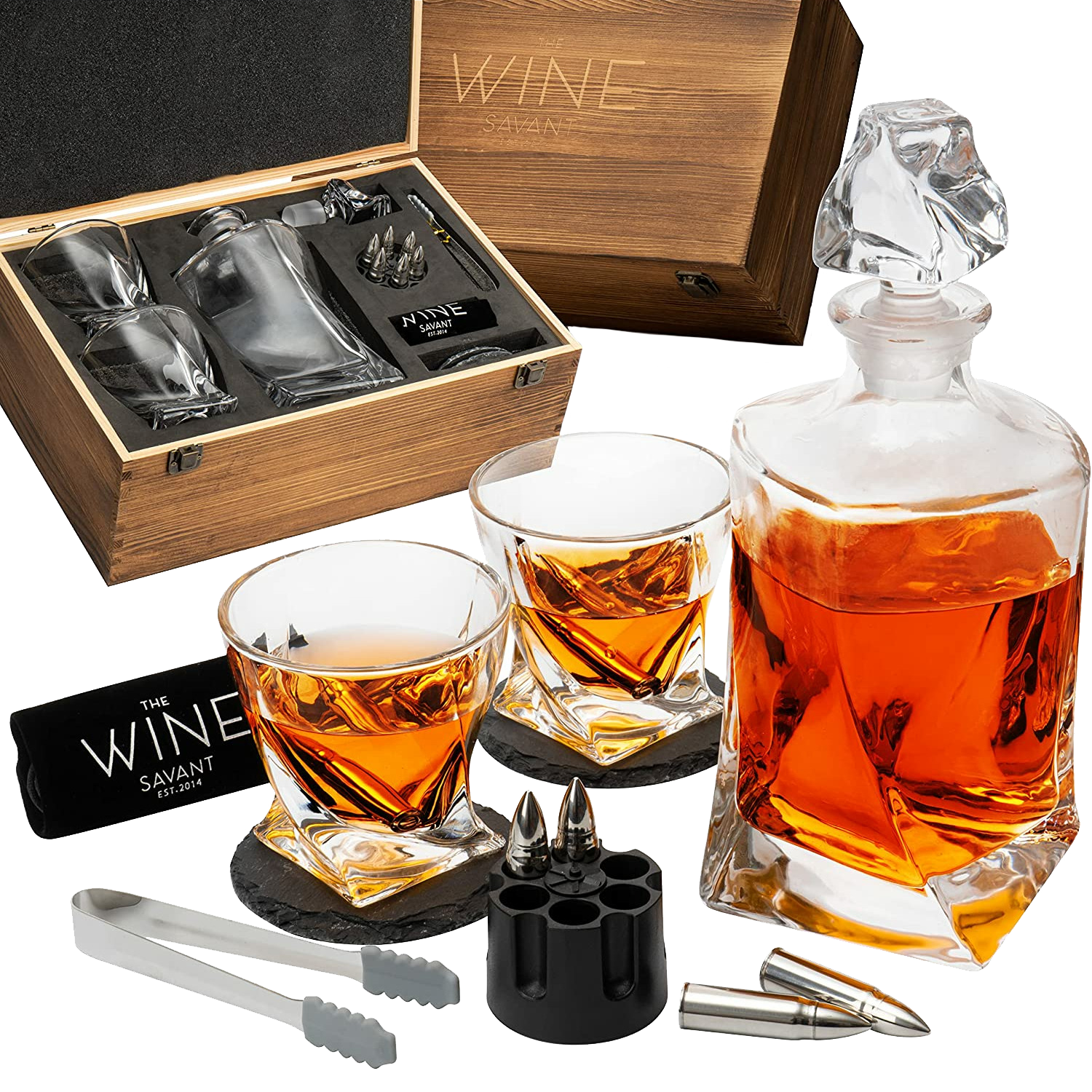 - Experimente la mejor experiencia de whisky con nuestro Deluxe Whiskey Decanter Set. Este es un complemento absolutamente perfecto para cualquier bar de casa, cueva de hombre o colección. Este es el artículo perfecto para usted, amigos, familiares o fiestas de negocios.