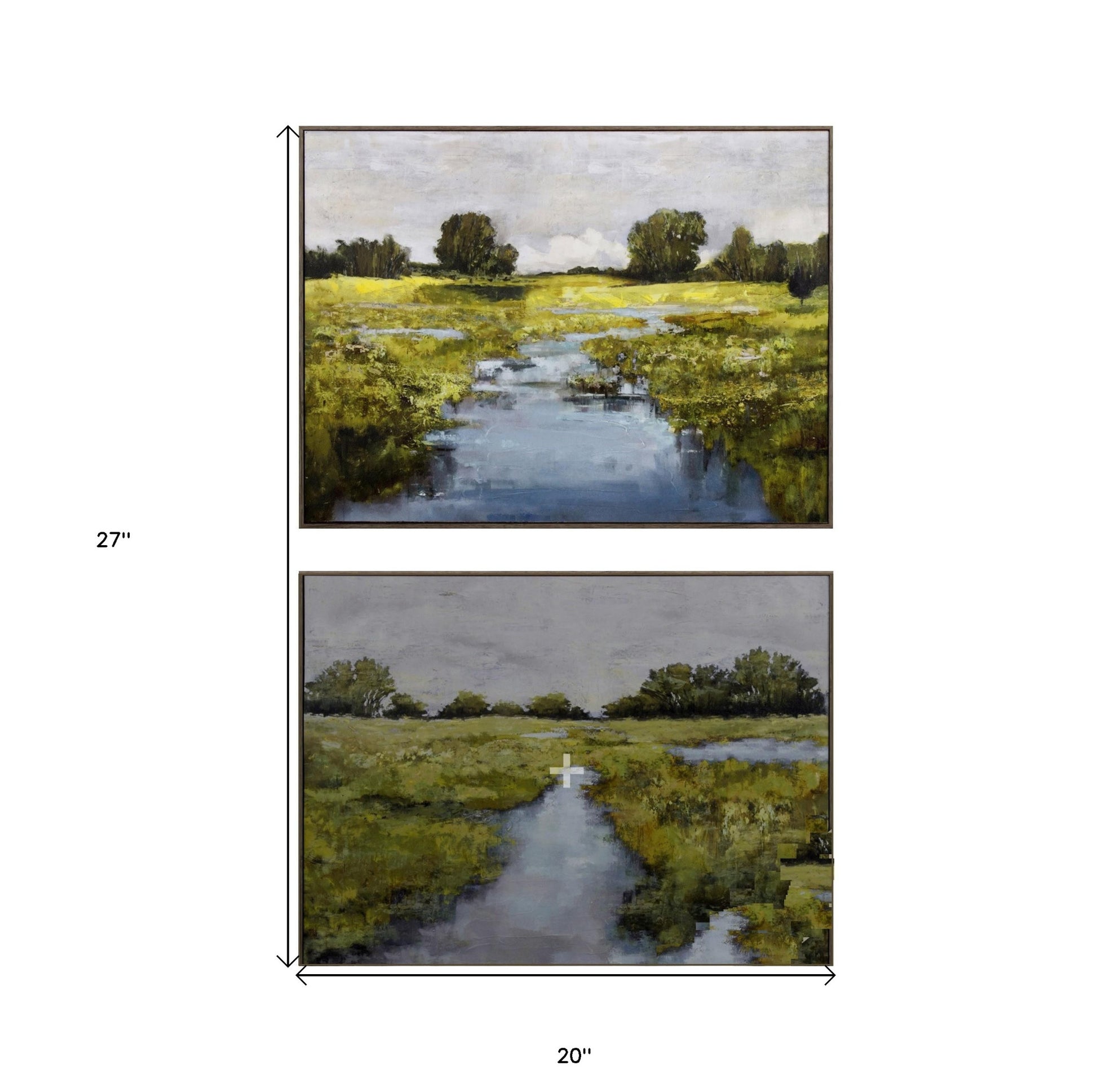 Featuring a serene landscape scene, this Peaceful Fields Wall Art is a traditional and charming way to decorate your space. These beautiful rectangular prints feature an acrylic overlay that is hand brushed to dry with a textured finish and then framed without glass by a distressed wood look frame. 25" x 31" x 2"