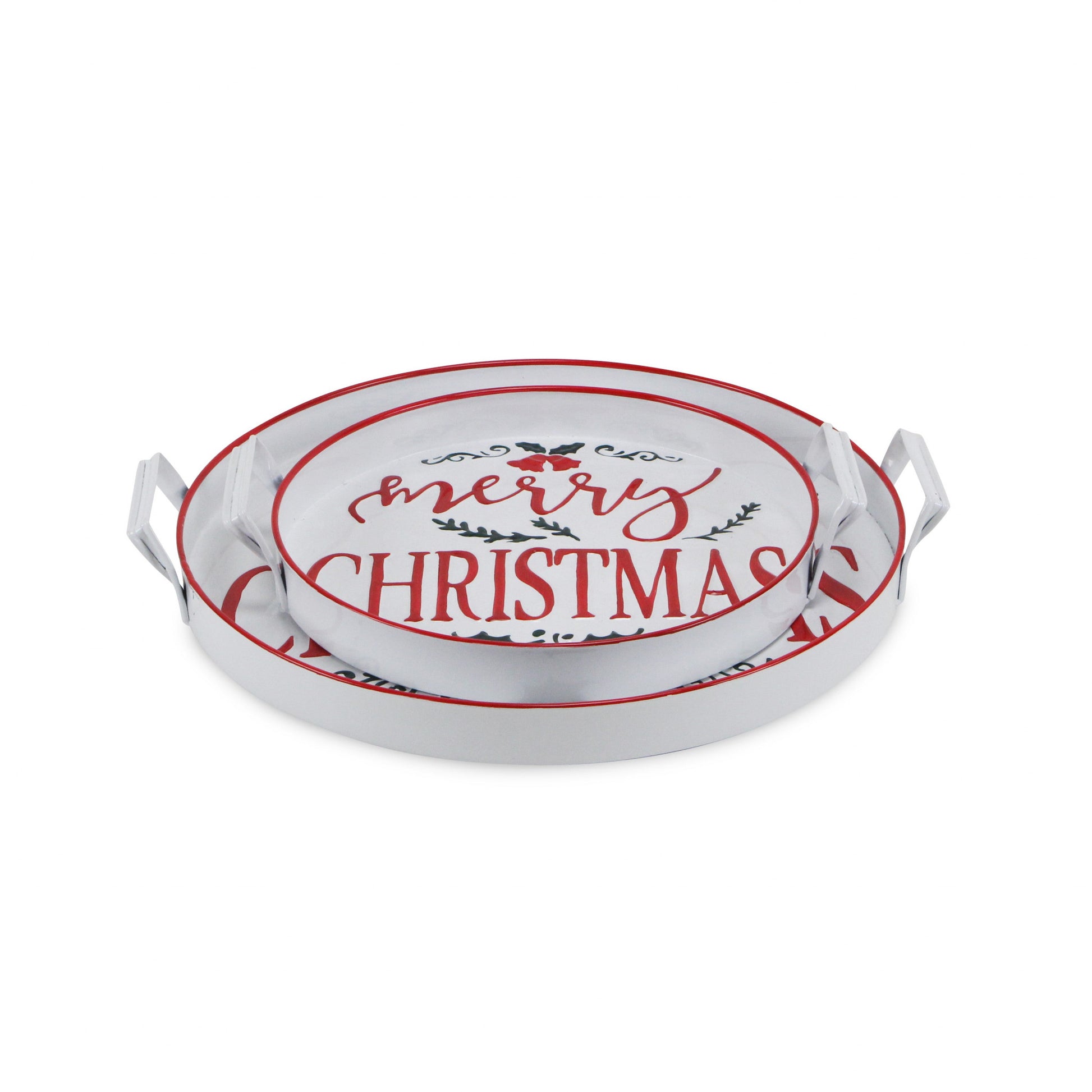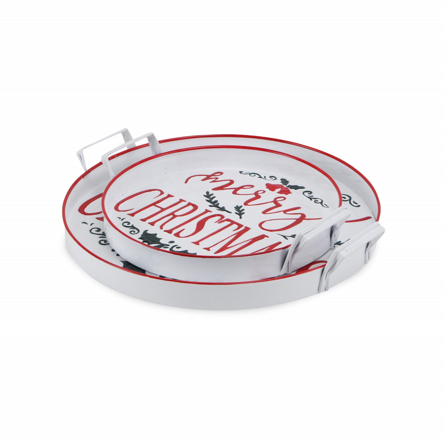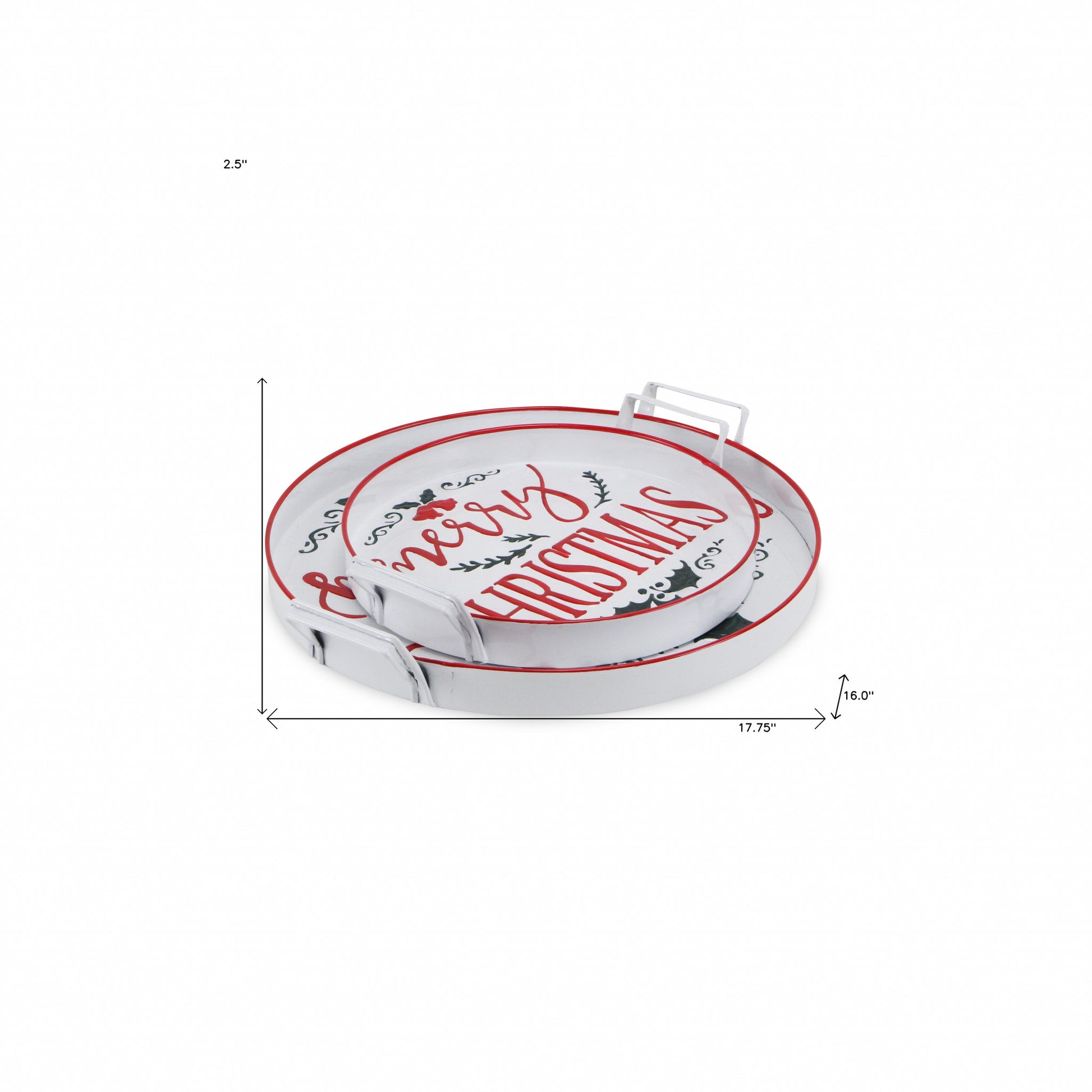 This 18" white round metal christmas handmade tray with handles is a handy and versatile addition to your home. Crafted from sturdy and durable metal, this round tray is versatile enough to blend with a variety of color palettes and aesthetics. Features handles for quick and easy transportation. This tray has a food safe finish. 2.5" H x 17.75" W x 16" D