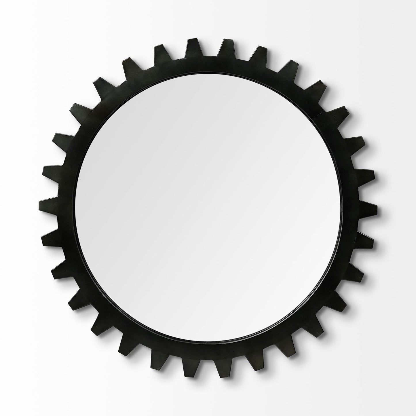 crafted in semblance of a cogs, this mirror will add noticeable variation to your space. whether used alone or paired with other mirrors, this mirror makes a huge difference in your decor. it is held in a black metal frame; add it to any room and enjoy the exceptional sparkle that ships with it. dimensions: 37".