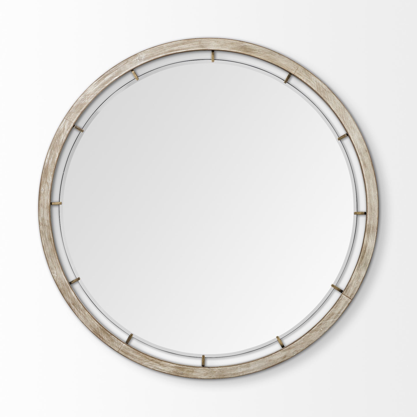 This round mirror with double frame and beautiful design is set to be an eye-catching piece in your home. Add it to your home for a beautiful update. The lovely brown finish renders a solid confirmation to its elegance. Dimensions: 54".