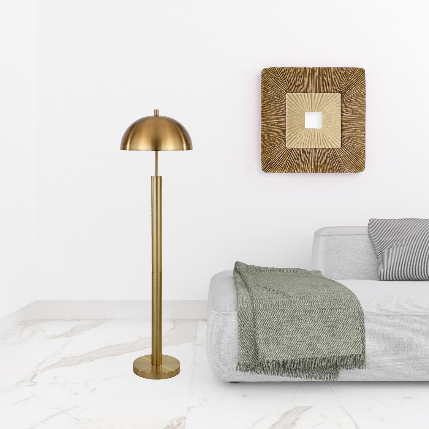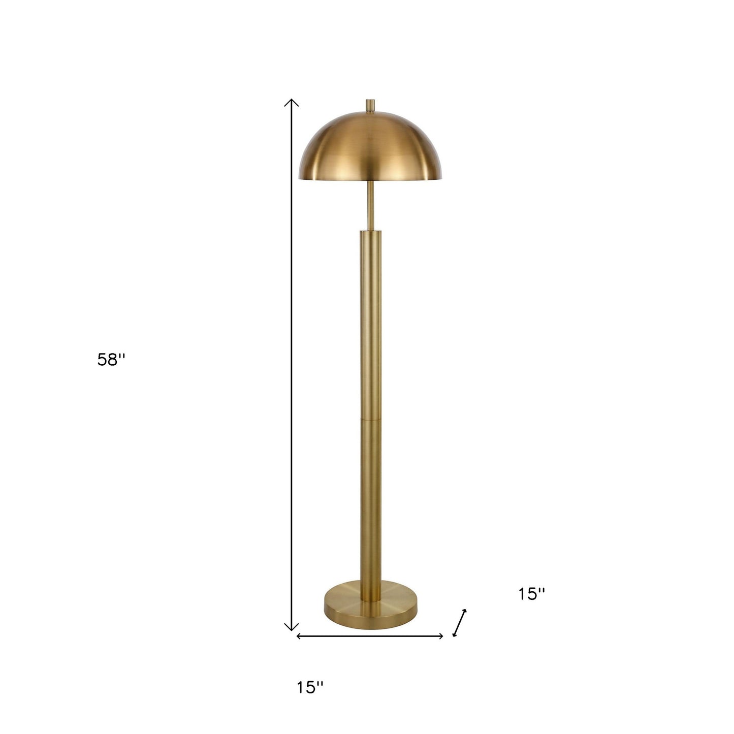 This 58" brass traditional shaped floor lamp with brass dome shade is a great way to add some brightness to any corner of your home. A gorgeous brass metal base bring just the right amount of pizzazz to this fabulous lamp. The brass base coloring infuses a warm and rich tone to your space. This good looking lamp includes a metal dome shaped shade. Classically styled, this traditional lamp features a straight pole that extends upwards from a single base. Use this lamp anywhere and elevate the look of the whole space. It is perfect for virtually any decor. 58" H x 15" W x 15" D