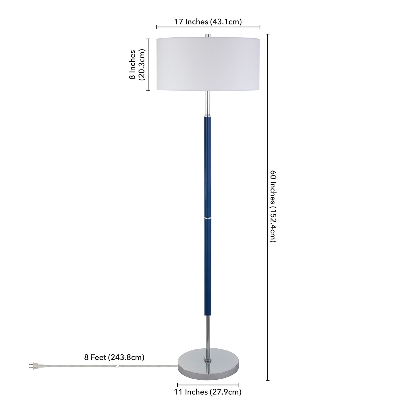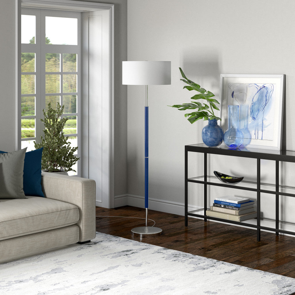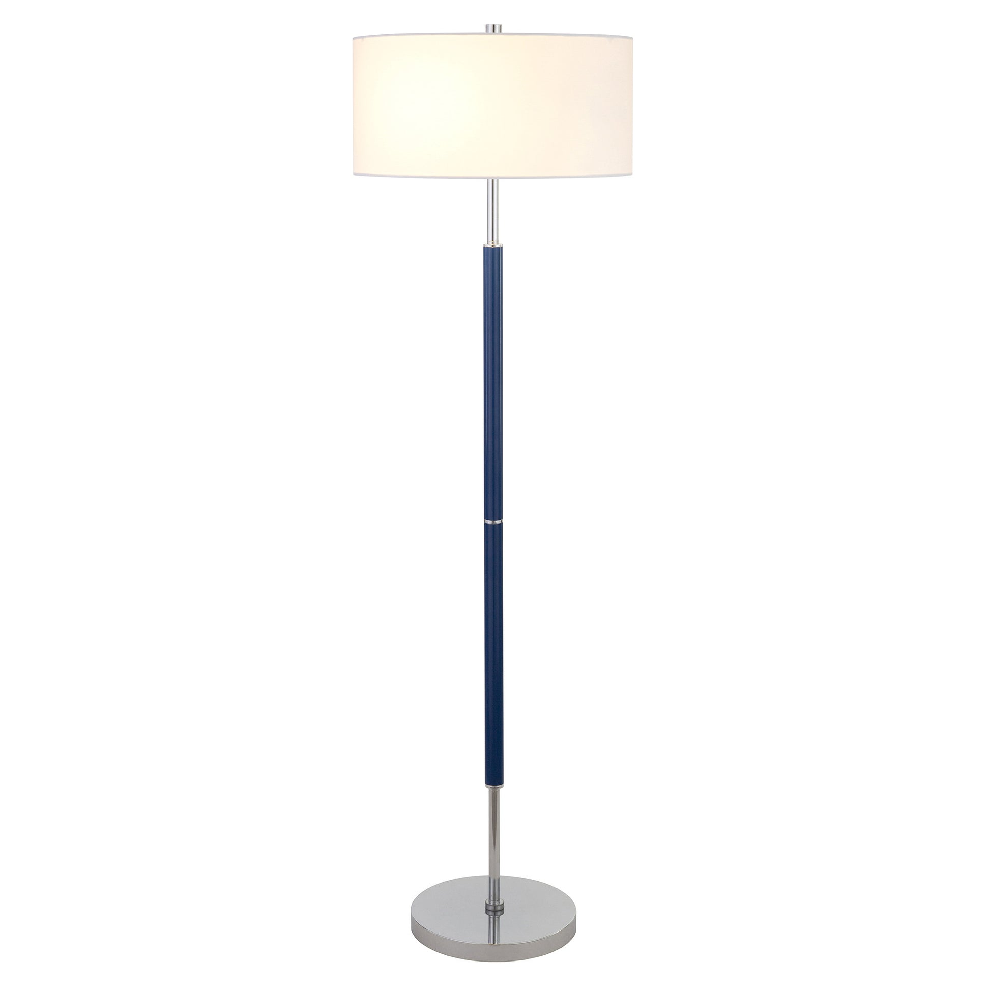 This 61-inch blue two light floor lamp with white frosted glass drum shade is a great way to add some brightness to any corner of your home. The base of this lamp is made of blue metal. The blue of this lamp creates a nice contrast with the white fabric drum shaped shade. Classically styled, this traditional lamp features a straight pole that extends upwards from a single base. Use this lamp anywhere and elevate the look of the whole space. It is perfect for virtually any decor. 61-inch H x 17-inch W x 17-inch D
