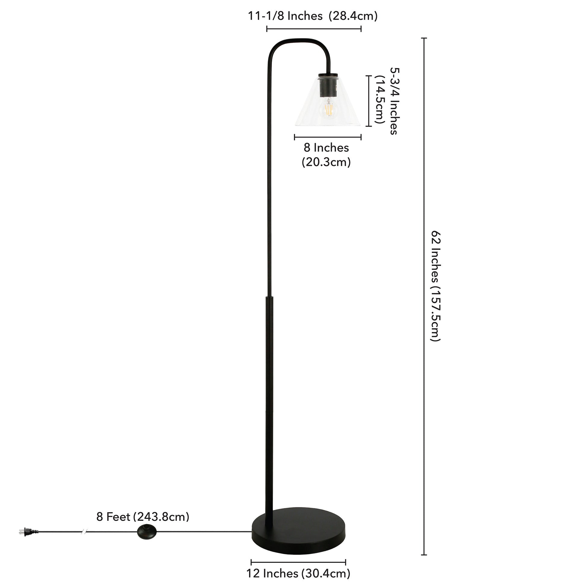 Embrace the good life with this hard working and stylish 62-inch black arc floor lamp with clear glass cone shade. The base of this lamp is made of metal finished in a black tone. This good looking lamp includes a glass cone shaped shade. A great way to shed light over those hard to reach areas, this arched floor lamp has a single base with straight pole that extends upwards and a long curving arm. Use this lamp anywhere and elevate the look of the whole space. The perfect lamp to create just the right natural and soothing light in your space. 62-inch H x 12-inch W x 12-inch D