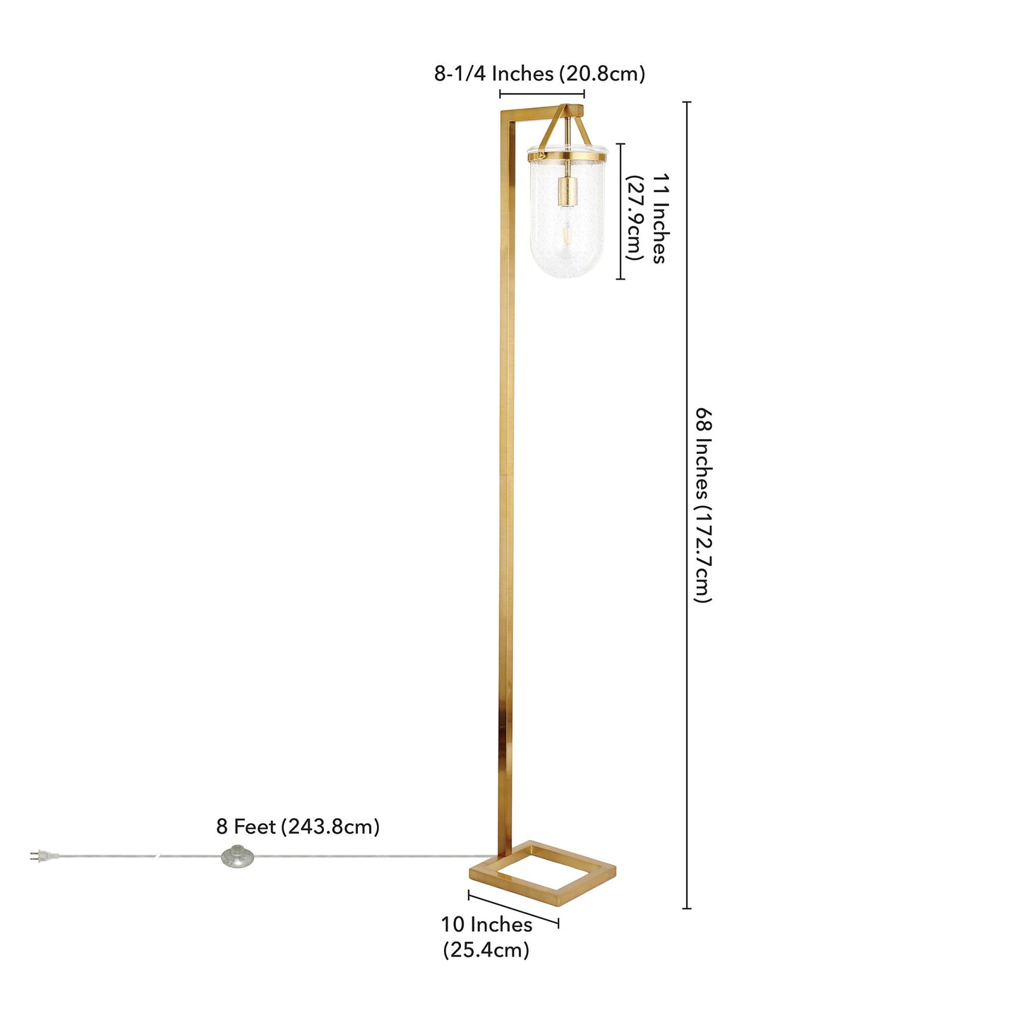 Add a bright anchor to your room with this 68" brass arched floor lamp with clear seeded glass dome shade. The lamp is made of sturdy metal and features a brass color. The brass base coloring infuses a warm and rich tone to your space. The lamp shade itself has a dome shape and is made of glass, which makes it a perfect choice. A great way to shed light over those hard to reach areas, this arched floor lamp has a single base with straight pole that extends upwards and a long curving arm. High quality design makes this a great lamp for not only lighting, but accenting a room with style. It is perfect for virtually any decor. 68" H x 10" W x 9" D