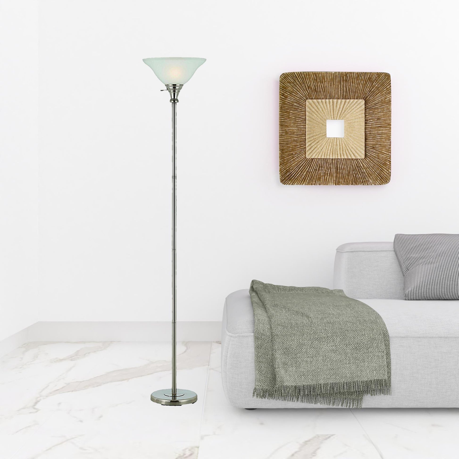 With this 71" nickel torchiere floor lamp with clear frosted glass dome shade you bring design along with some warm ambient lighting to your space. The lamp is made of sturdy metal and features a nickel color. The nickel of this lamp creates a nice contrast with the clear glass dome shaped shade. Add a soft warm glow to your space with this classic torchiere styled lamp. A straight pole extends upwards from a single base while the scooped shade shape refracts light upward and outward much like it's name sake,a torch. The light that this lamp throws is soft and warm to elevate the look of most any space in your home. The perfect lamp to create just the right natural and soothing light in your space. 71" H x 13.25" W x 13.25" D