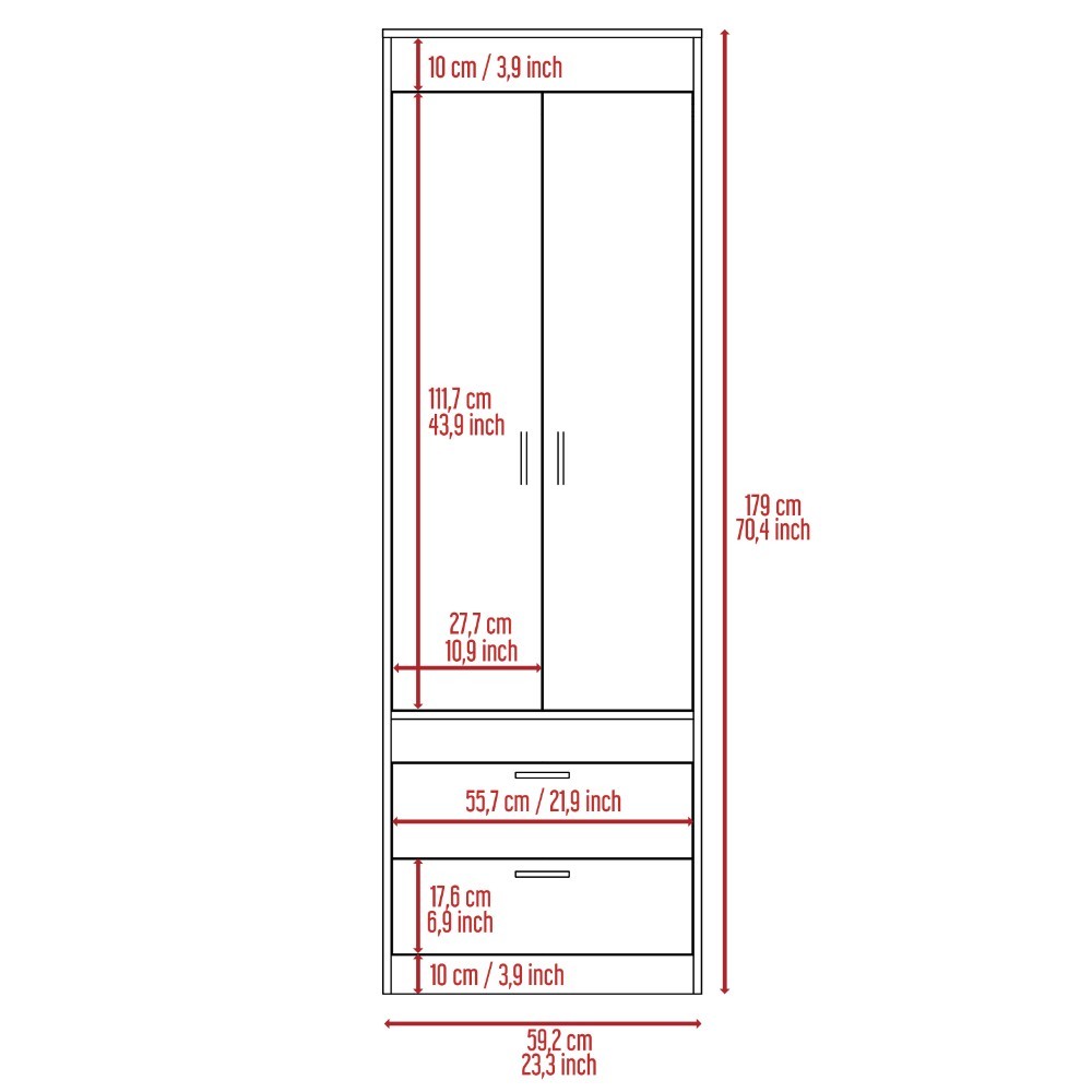 The Tarento armoire is a beautiful and spacious option for your bedroom, it includes 2 doors and 2 spacious drawers. A covered hanging rod will help you store anything you will need. It´s an ideal fit for your bedroom or garage, It's the perfect solution for extra storage in limited-space rooms, designed with elegant light grey manufactured wood.
