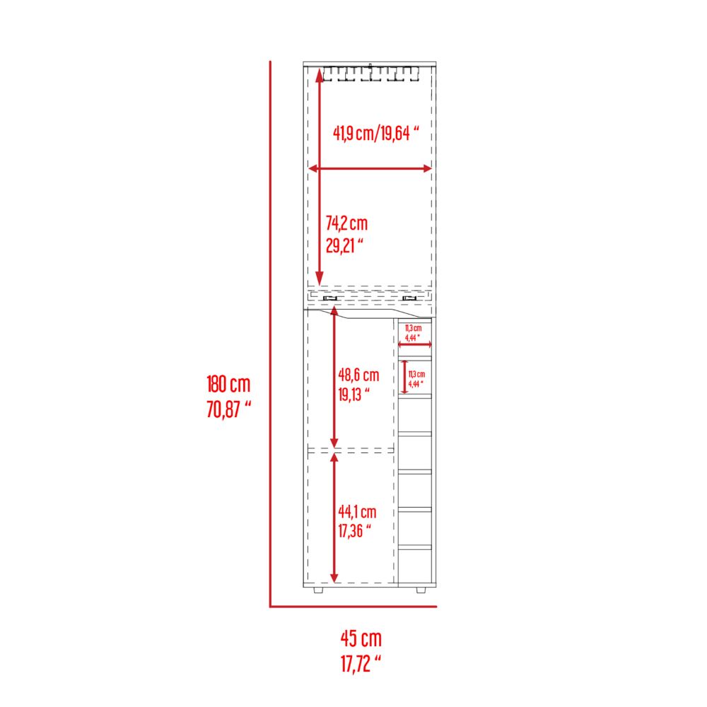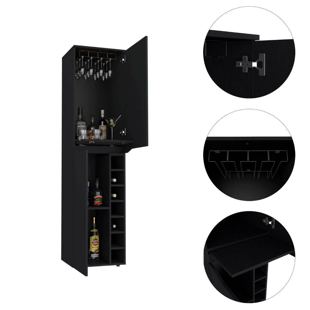 Bell Tall Bar Cabinet, do you want a stylish, unique bar with ample storage space? The Bell Tall Cabinet is what you always dreamed of! This piece features seven wine cubbies (4,44'') and a mobile shelf that can be customized to fit your favorite cocktails. It also includes two individual one-door cabinets with two Interior shelves (19,13''H X 17,36''H) for more storage! It's perfect for any space add your favorite drinks, and you're ready to go! Designed with elegant black wengue manufactured wood finish.