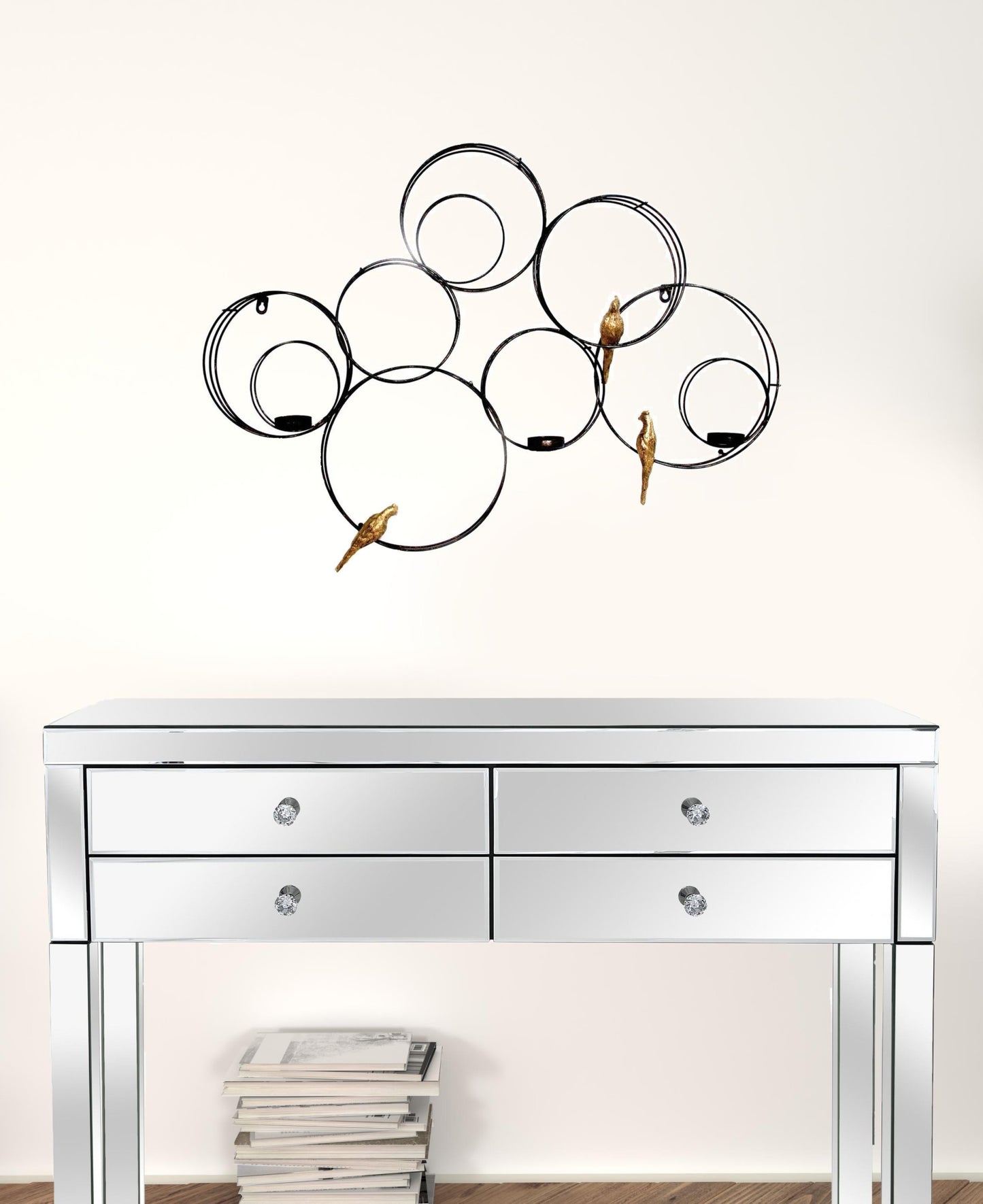 Take your interior style to the next level with this elegantly constructed Gold Birds Geometric Wall Décor. The incredibly modern geometric design features black circles with three shiny gold birds for visual intrigue while the votive candle holders add to the beauty of the piece. Made of iron and glass to not only ensure durability but also offer a stylish contemporary touch to the bare walls. It’s time to give your modern space a gleaming touch of nature with this three-dimensional wall art that stands out in your foyer, office, or sunroom as a classic piece of wall décor. 21.5” x 31.5” x 2.5”