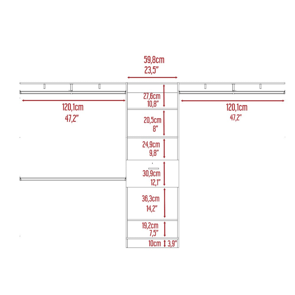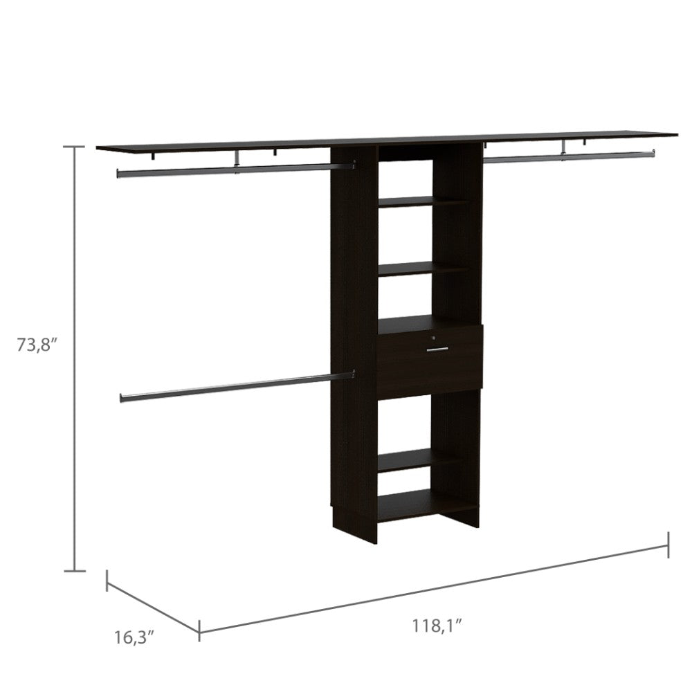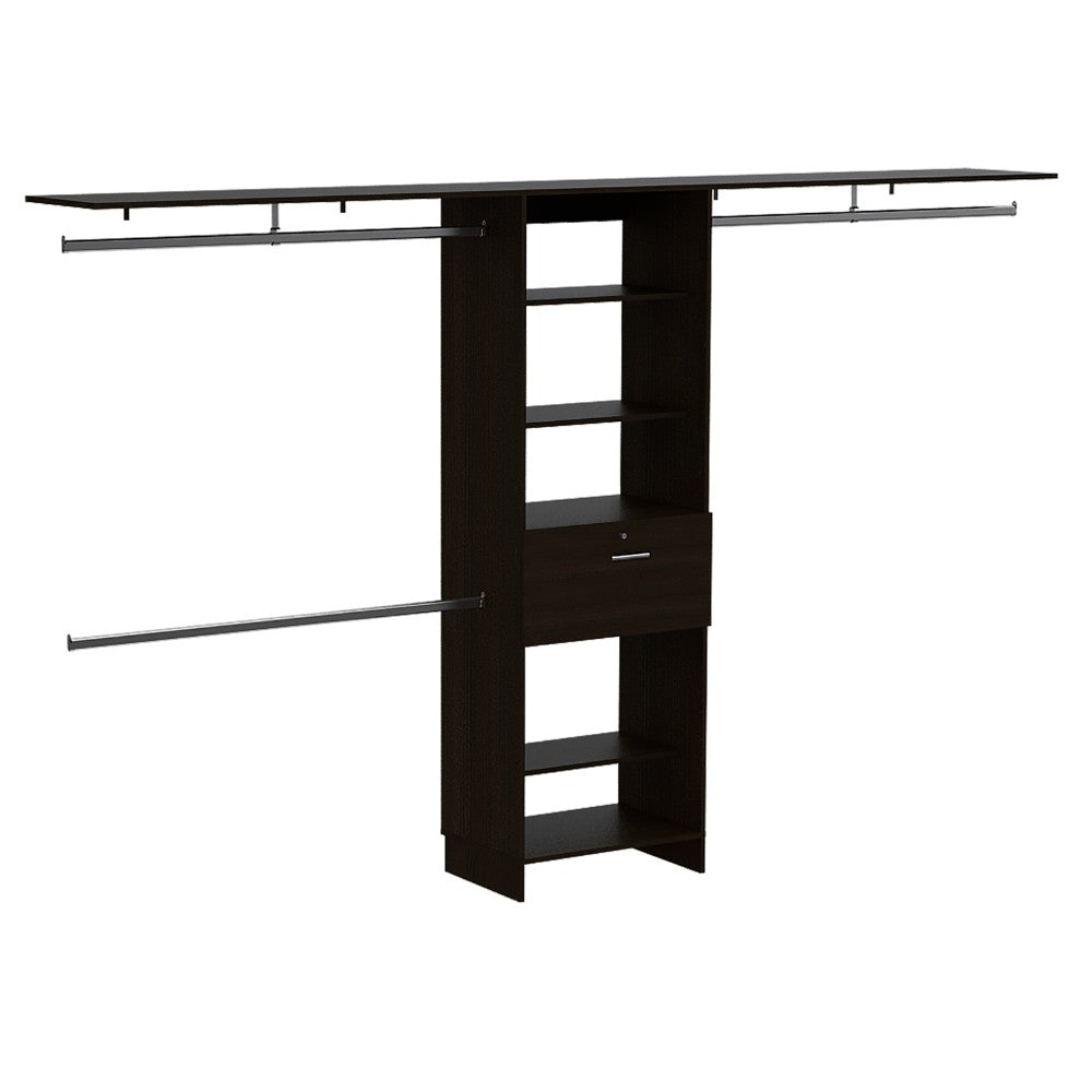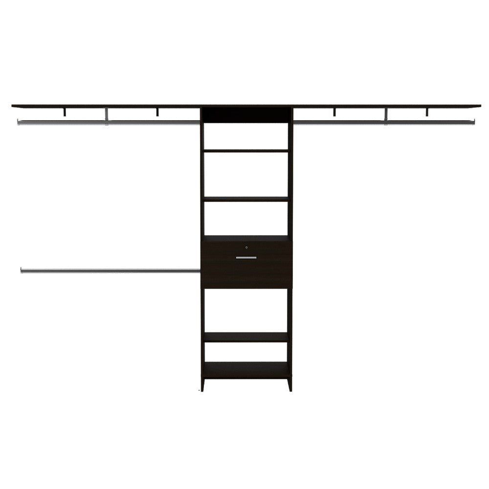 The Ashland closet system is the perfect option to organize your dream space, you will think of the best outfit ideas for every occasion, it includes five shelves, one drawer, and three hanging rods. Designed with dark walnut manufactured wood.