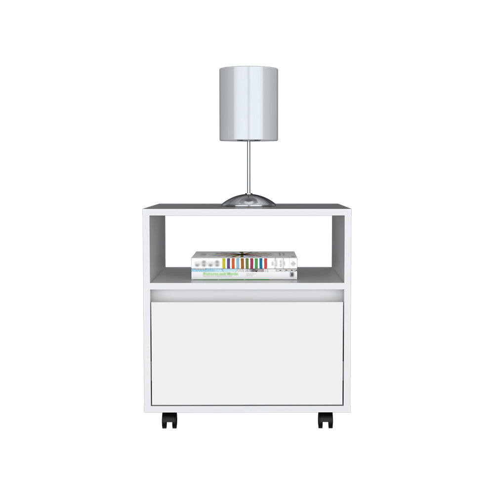 The Munyoch Nightstand features casters, making it easy to move around your room. It also has a drawer (15,5"W X 13,2"D), perfect for keeping your belongings tidy and out of sight. The open cabinet is excellent for storing books, controls, or your favorite decoration (17,7"W X 15,7"D). And the top surface is comprehensive and perfect for your needs. Order your Munyoch Nightstand today!