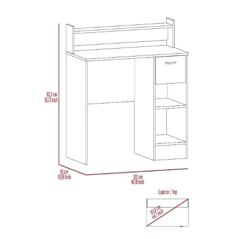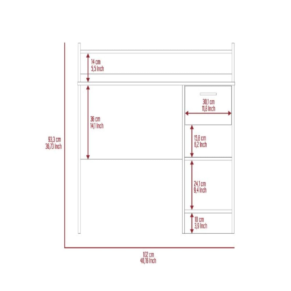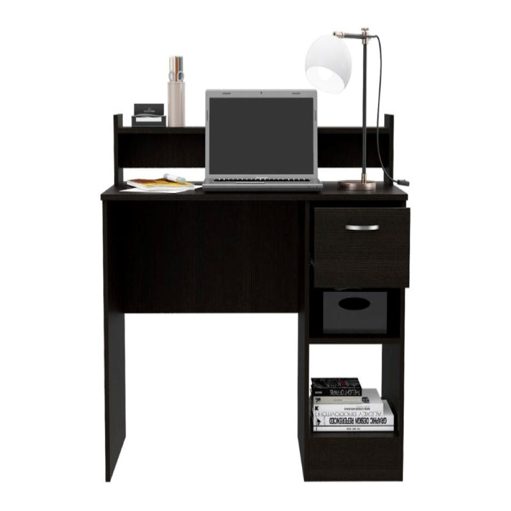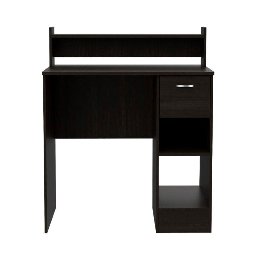 The Dubaii computer desk is a classic piece that will cover your back when it comes to today's needs of remote learning or working from home. Standing 31.2" inches high and 40.2" wide, this desk is perfect and has a straightforward design for spaces with limited space available. Featuring one spacious top drawer and two open bottom shelves is ideal for keeping things neat and organized while you work or study. A special touch is a small hutch on top that allows you to set up your decorations, cards, and picture frames. Designed with elegant black wengue manufactured wood finish.