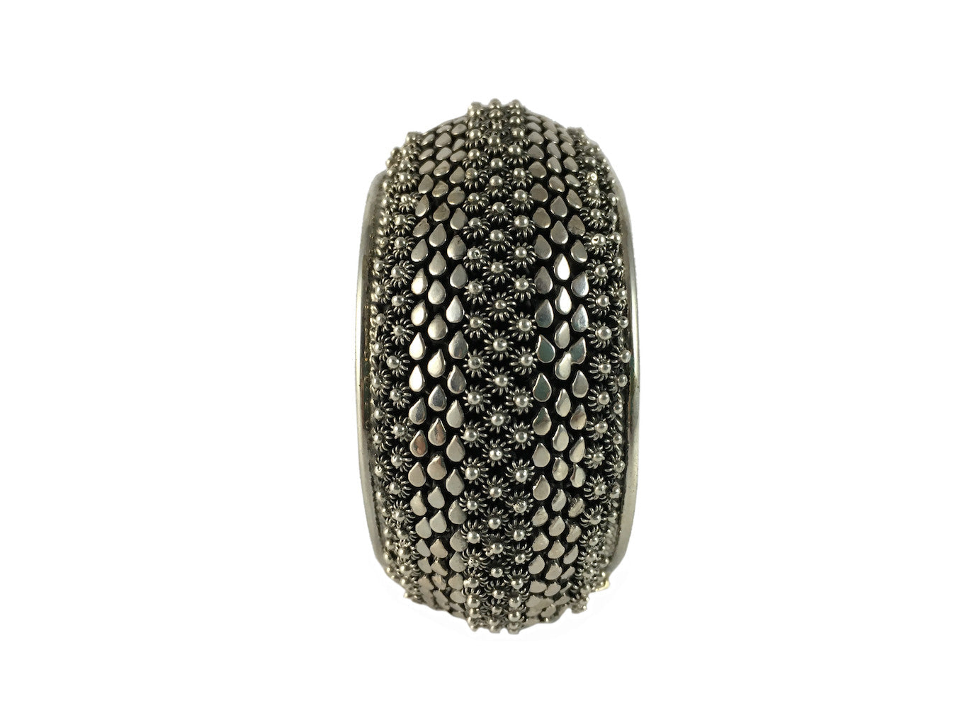 Make a statement with this bold, snakelike cuff. The patterns and styles of this statement piece have been used for generations to adorn the Lao Royal Family and their Court. A royal feast of dok phikoun flowers and tear drop shaped silver studs roll over the cuff and across your wrist. This piece is purposely antiqued to heighten the depth and style of the dok phikoun.