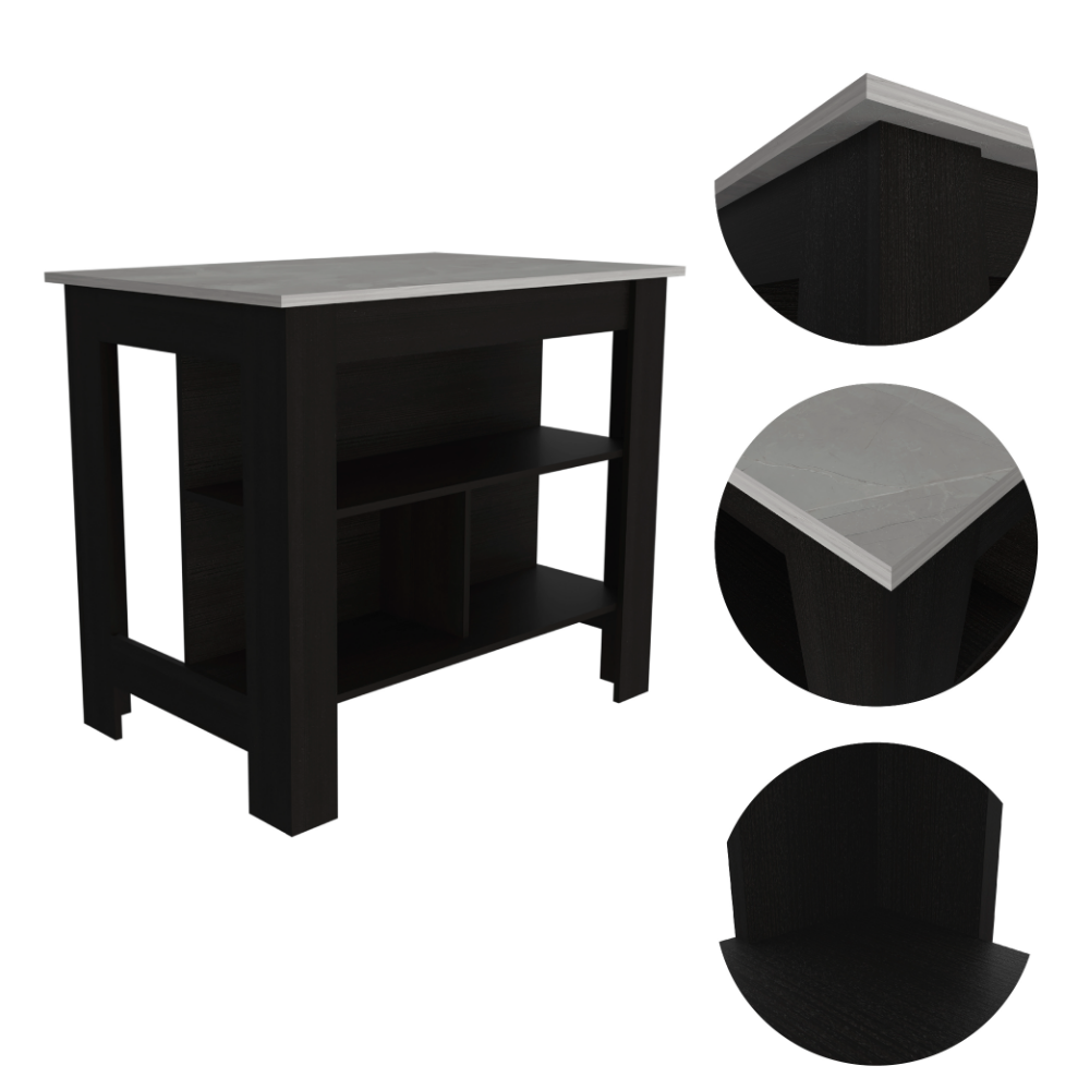 Falacini Kitchen Island, this unique kitchen island brings life to the interior of your kitchen thanks to its modern ergonomic design; it also has colors that give glamour, luxury, and elegance to the interior of your kitchen; this kitchen island is an excellent choice for medium and large kitchens that want to give life and unique designs, it is an efficient piece of furniture that does not occupy great space inside your kitchen. It is made of wood with a beautiful color combination between the base and the top. It will enhance your kitchen space by giving you a spacious top surface (27 inches deep x 40.5 inches wide) with scratch-resistant melamine. Below the top, you will find a great space to store your stools on one side and a convenient shelves space on the other, with one wide shelf at the top and two smaller frames at the bottom. This shelving space is a practical place to store your pans, pots, or even decor looks fantastic on this kitchen island. Designed with an elegant black wengue and light gray manufactured wood finish.