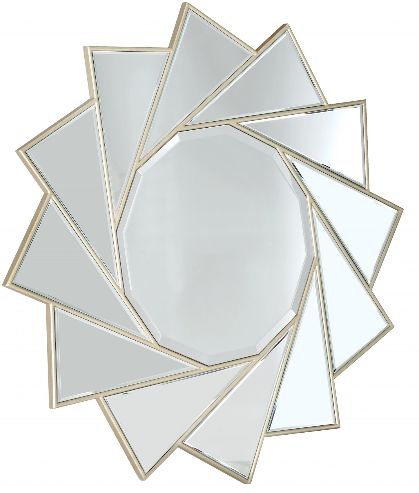 While contemporary in appearance, the Gold Trimmed Pinwheel Mirror is a modern masterpiece that will hang as an eclectic complement to update your traditional decor. The gold trimmed outline will give the mirror that pop of color that it needs to stand out in your home. With the dependence on thin gilded outlines and geometrical triangular shapes, the mirror is subdued yet striking, ensuring that it will shine like a star against any neutral backdrop. 35.4"x 35.4" x 0.7".