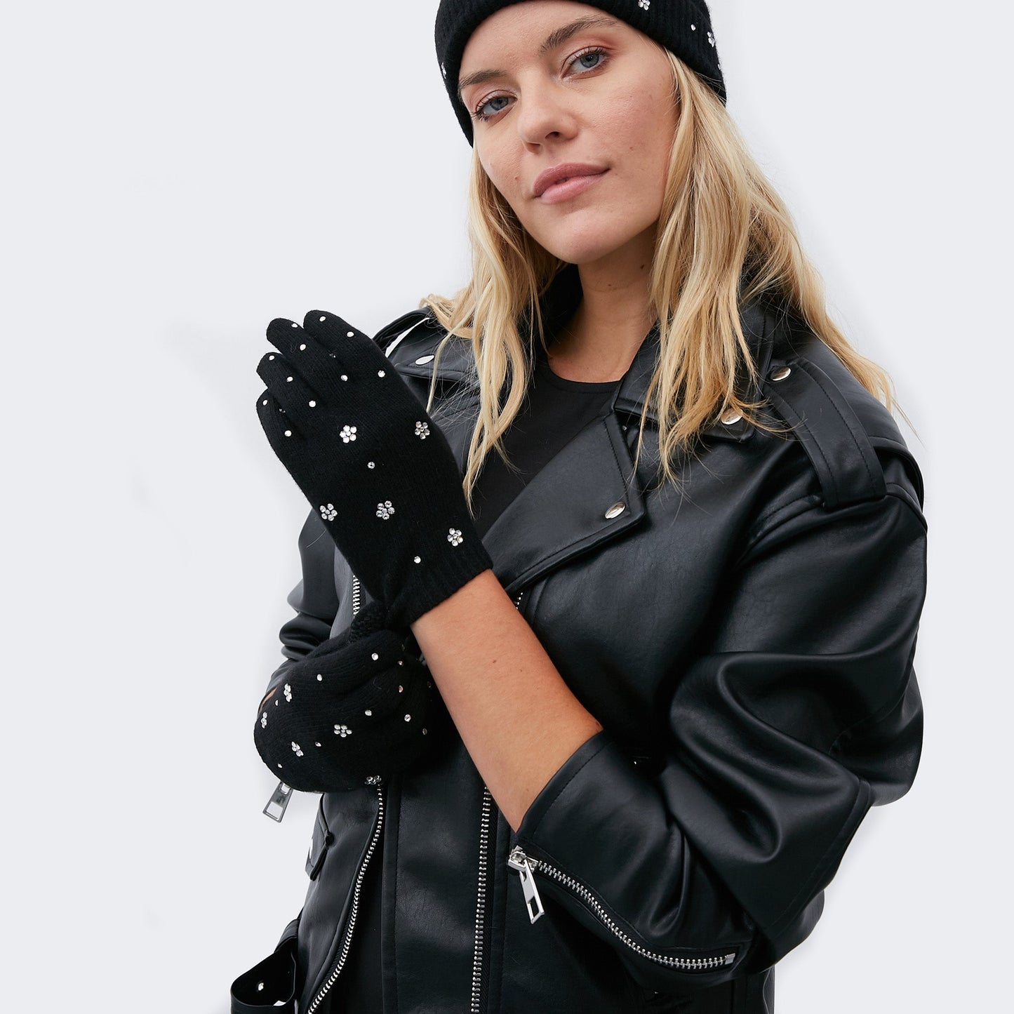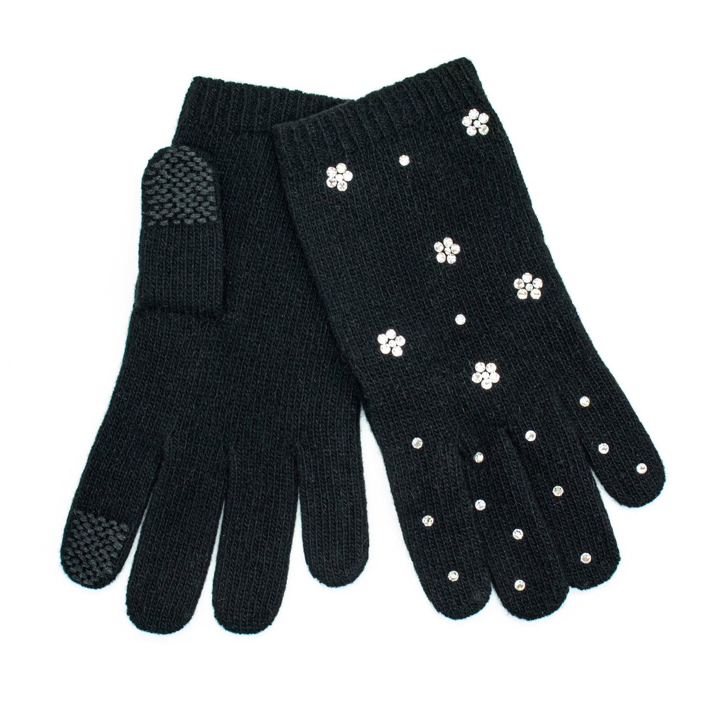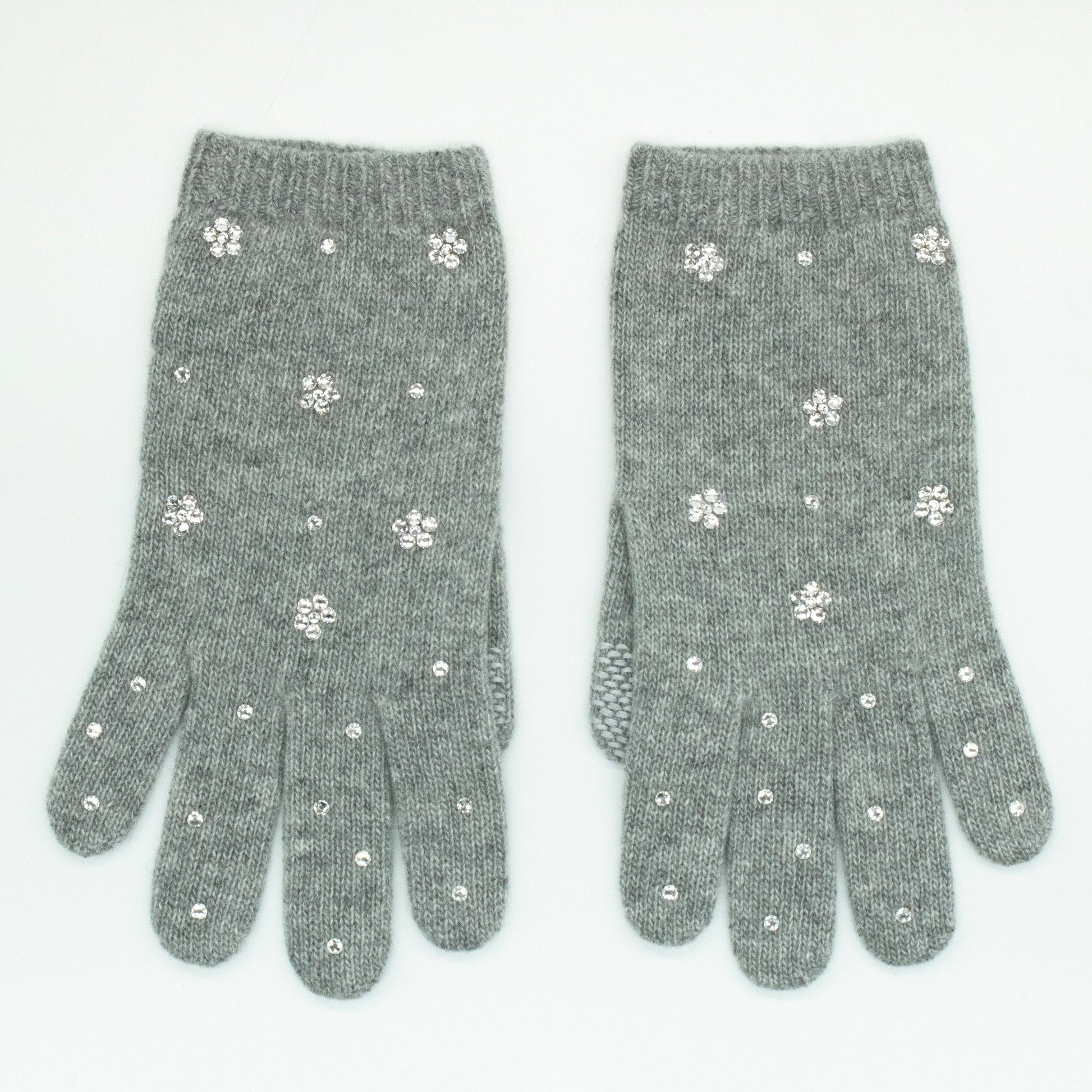 Ladies Gloves, body in all over plain jersey stitch , 1x1 rib cuff , scattered clear hotfix stones.