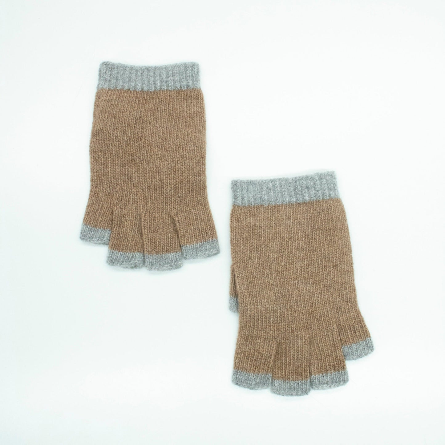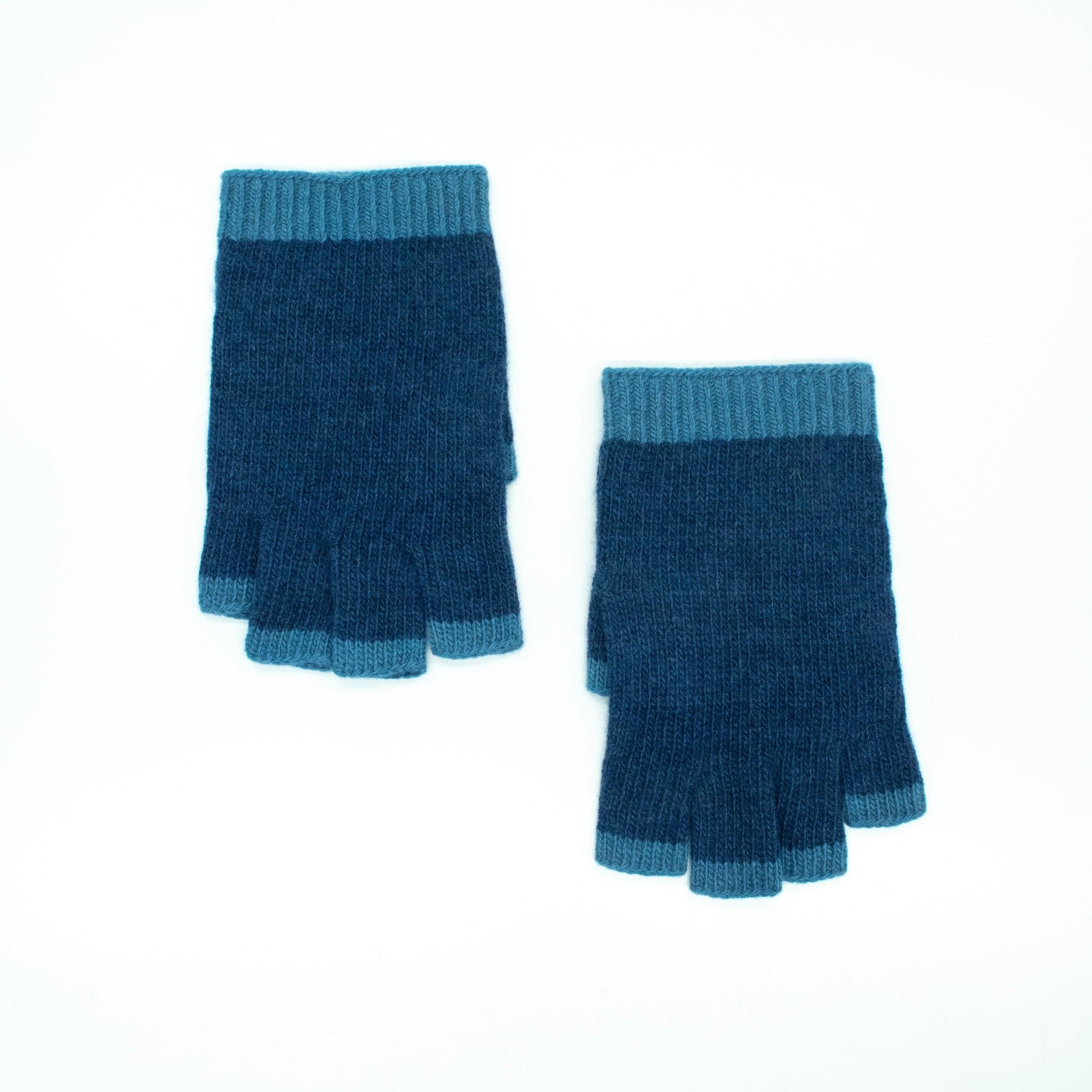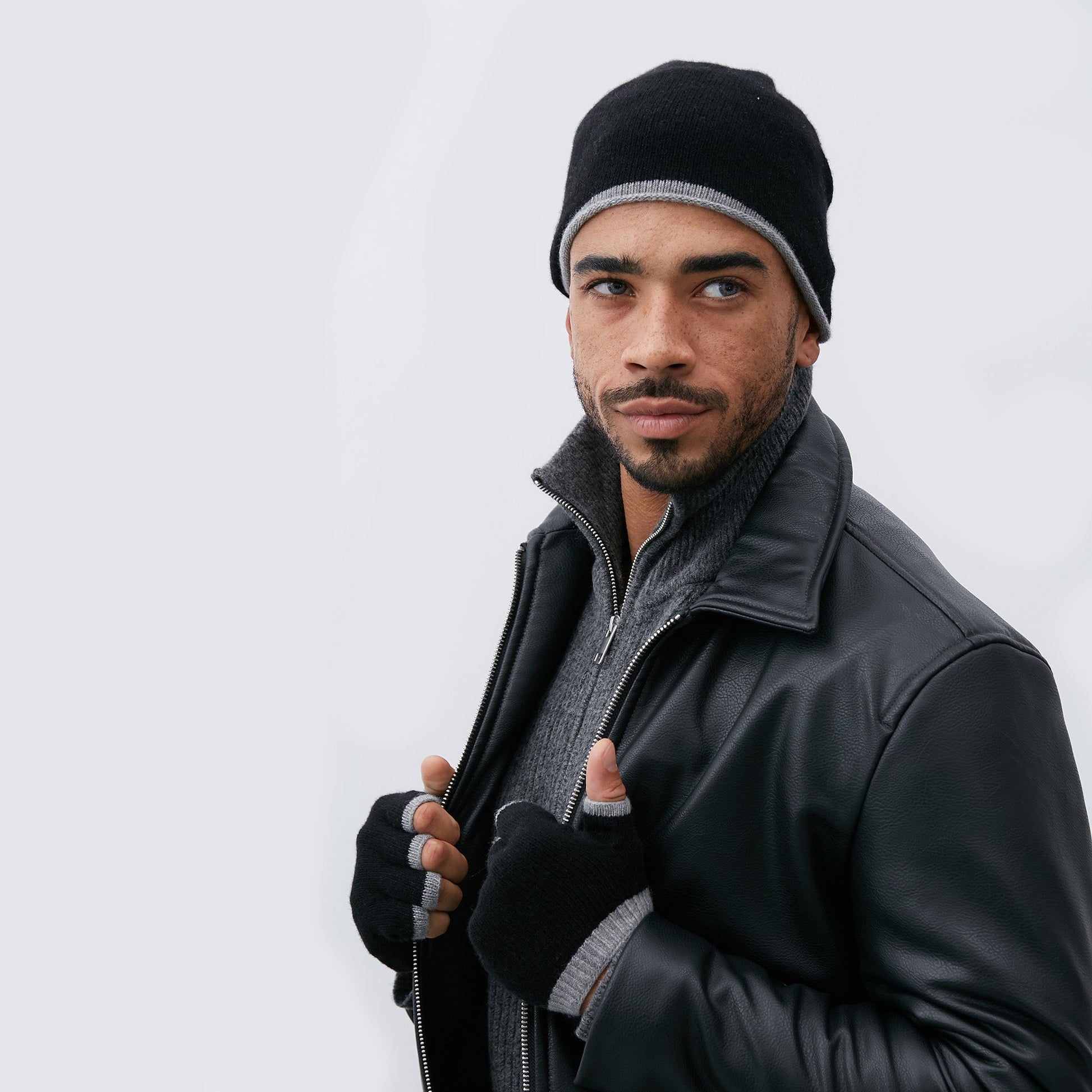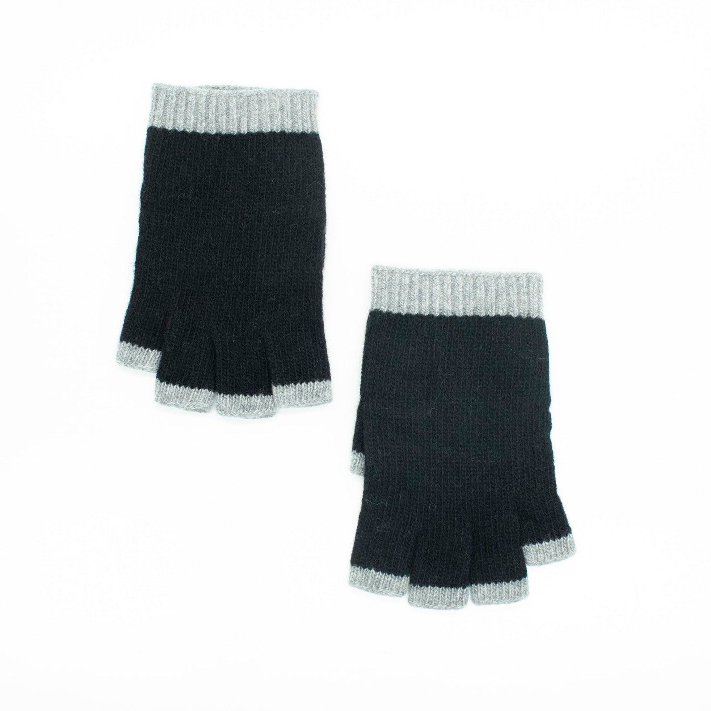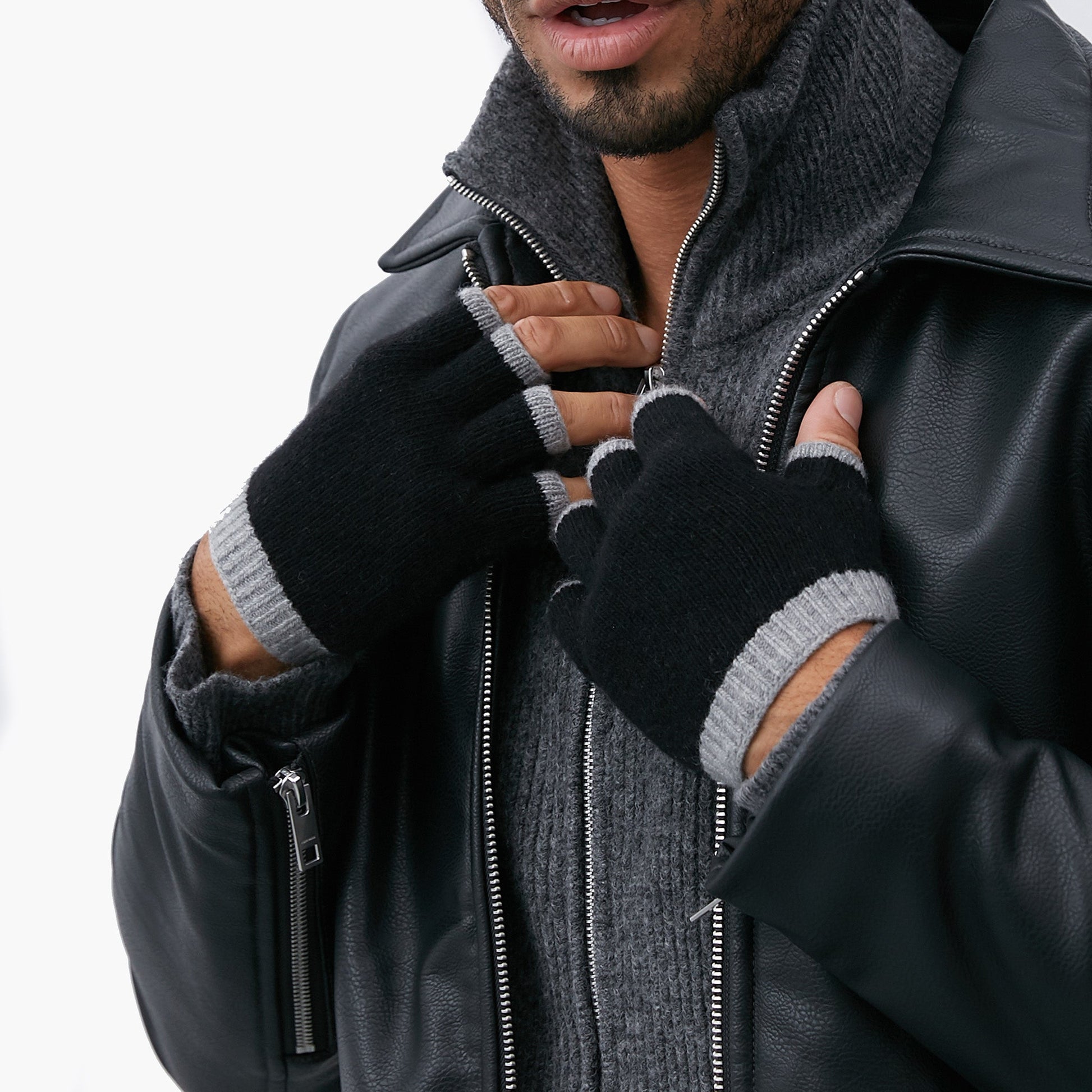 Men's fingerless glove, body in all over plain jersey stitch with contrast edges.