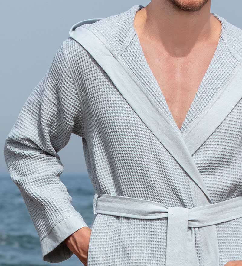 Luxuriously comfortable Turkish cotton waffle bathrobe with hood to help keep ease of mind all day long. Relax in this soft waffle knit robe for men with a refreshing and clean aesthetic.
