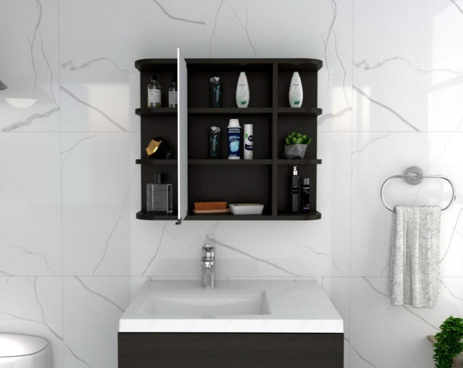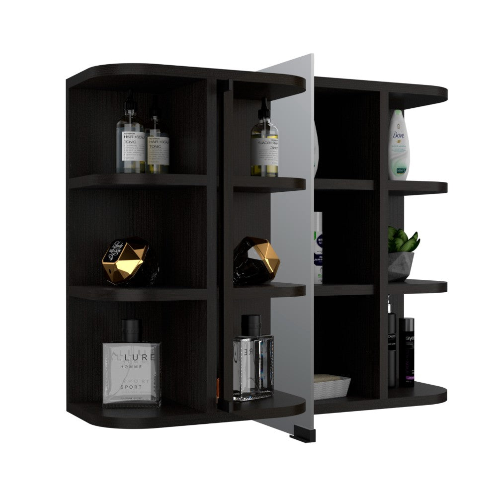 The Milano Medicine Cabinet is an elegant and functional piece that with a mirrored cabinet door and multiple exposed rounded shelves will provide you with a great product for your bathroom and safe from harmful edges. Three open shelves on each side, a mirror panel door in the center for extra privacy, and three center shelves make up the center console. Designed with Black Wengue manufactured wood.