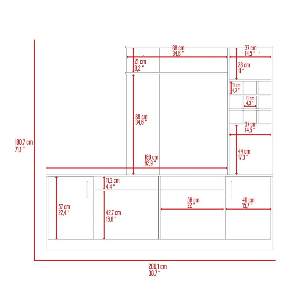 The Modoc entertainment center is modern, stylish, and practical. This furniture is a beautiful addition to your home, not only for extra storage, but you can also organize it with your unique, fashionable style. Includes a tv shelf for up to 60”, which is excellent for that modern touch in your home, and you can also reveal all of your favorite decorative elements on the countertop (203,5'') and includes six cubbies (4,3''H X 4,3''W) Designed with elegant Black Wengue manufactured wood finish.