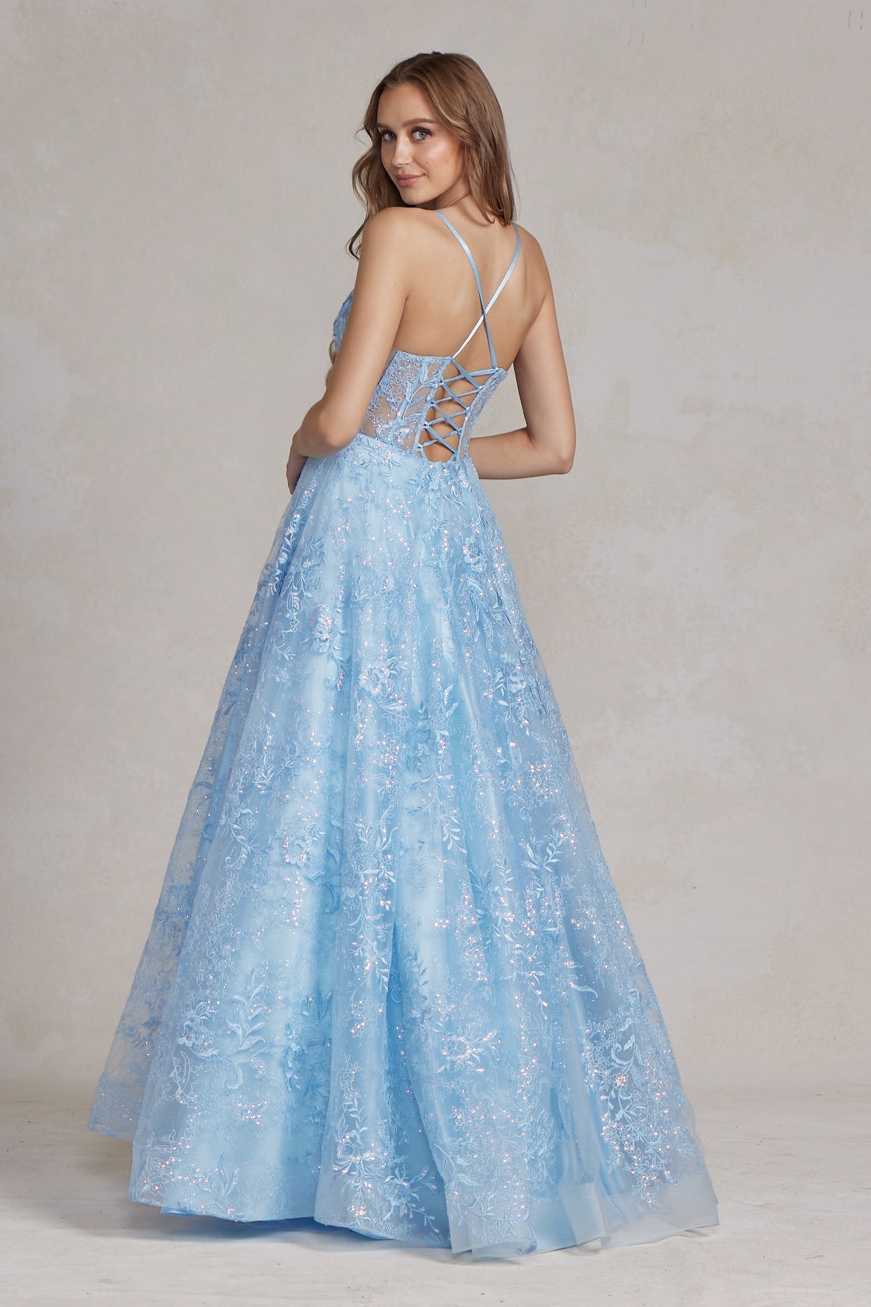 This glamorous floor-length gown features sheer corset bodice adorned with an elegant crystal-embellished waistband, along with delicate spaghetti straps. The sophisticated lace design gives the dress a timeless look, while the straps provide an extra touch of sophistication.