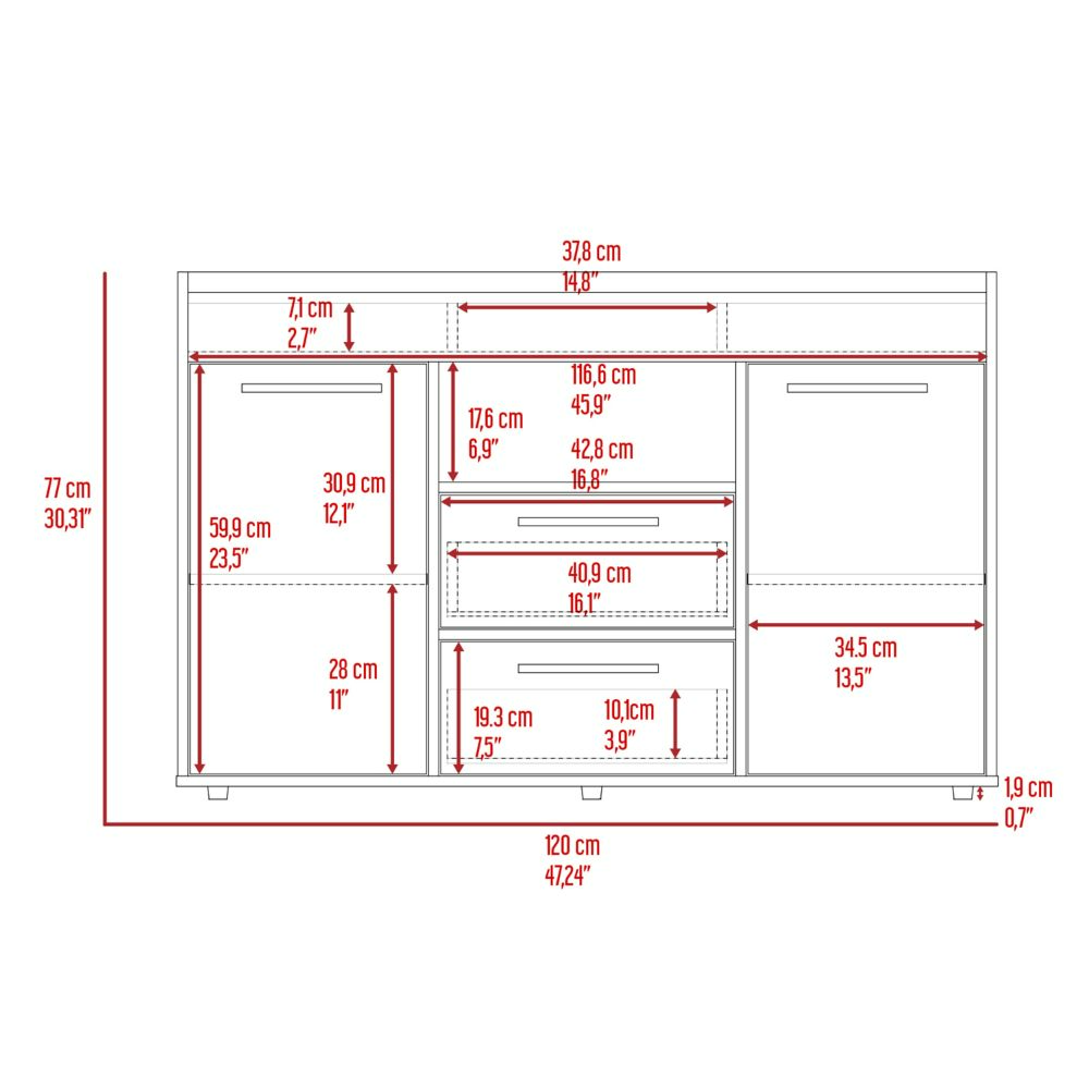 Perssiu sideboard, if the style of your home has always been between modern and contemporary without losing elegance, The Perssiu sideboard is the perfect option to complement your spaces. It is an excellent option for your rooms with two large drawers (16,8''W X 6,9''H) and two cabinets with interior shelves(13,5'' W X 12,1''H)Its Superior Top is perfect for your decorations(49,5'') Designed with elegant dark walnut manufactured wood finish.
