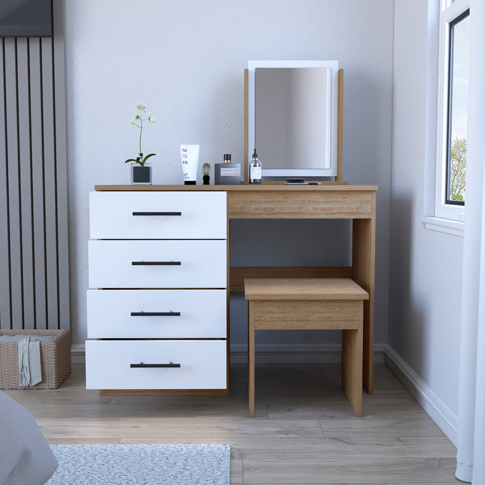 Makeup Dressing Table Roxx, Four Drawers, One Mirror, Stool, Pine / White Finish