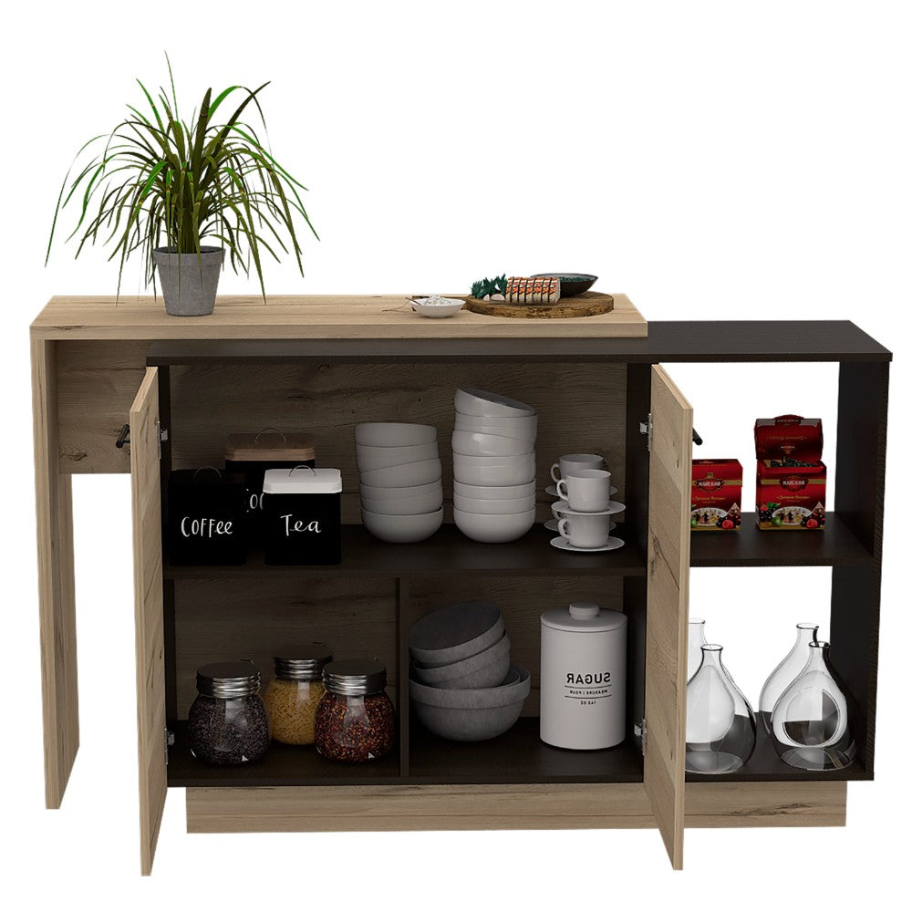 The Ohio Kitchen Island is the perfect mix of functionality, elegance, and superb design. With a two-level countertop, this product has many features for your convenience if you will have plenty of legroom to sit on the kitchen island and enjoy dinner while sitting on a stool. Modern and elegant design with surface and color combinations, perfect as an auxiliary dining table, two open shelves to display decor, and three interior shelves, designed with Black wengue and Light Oak manufactured wood.