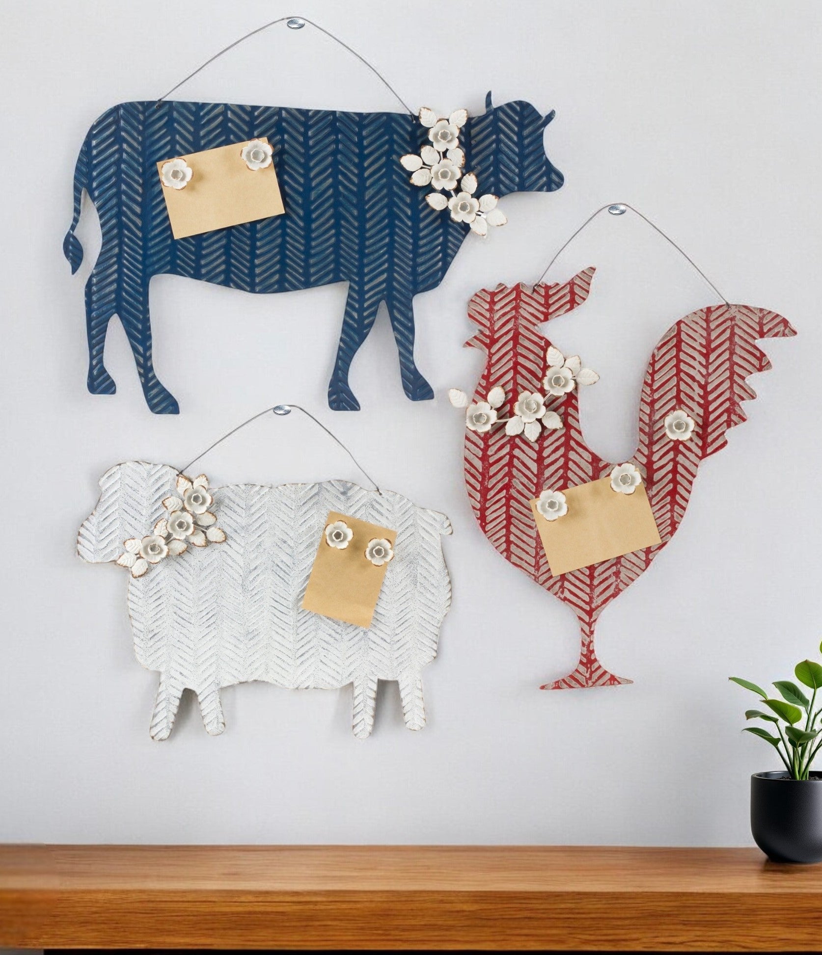 Bring some sizzle to your space with this eye-catching set of three 18-inch x 22-inch red white and blue farm animals metal magnetic memo board. Instantly liven up your space with this art that brings color and dimension to your walls. Update your walls with this farm animal decor. Hang on your wall to add some up to date fashion and decoration. Utilize this opportunity to create a focal point in the room with this fabulous wall decor option. 18.25-inch h x 22-inch w x 0.75-inch d