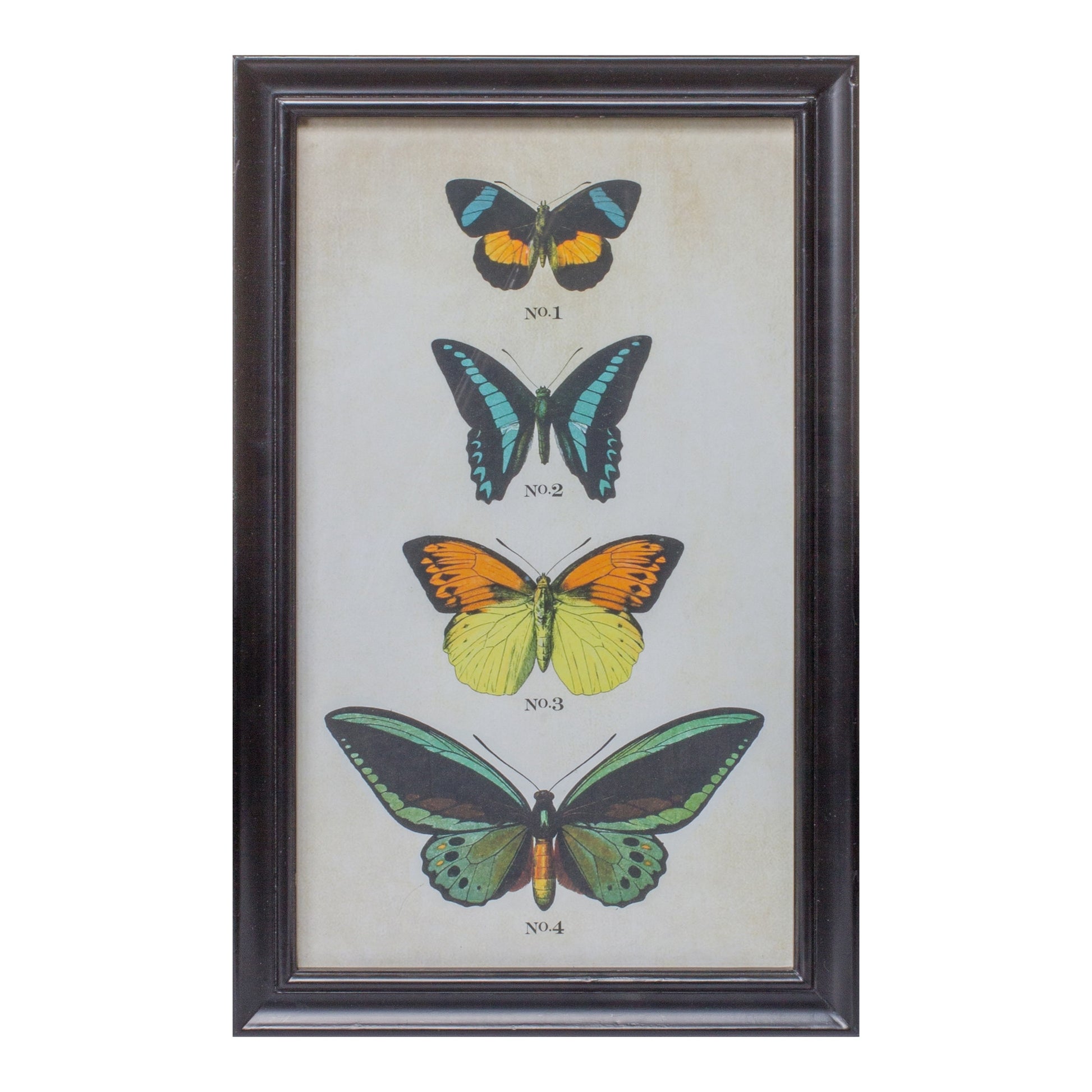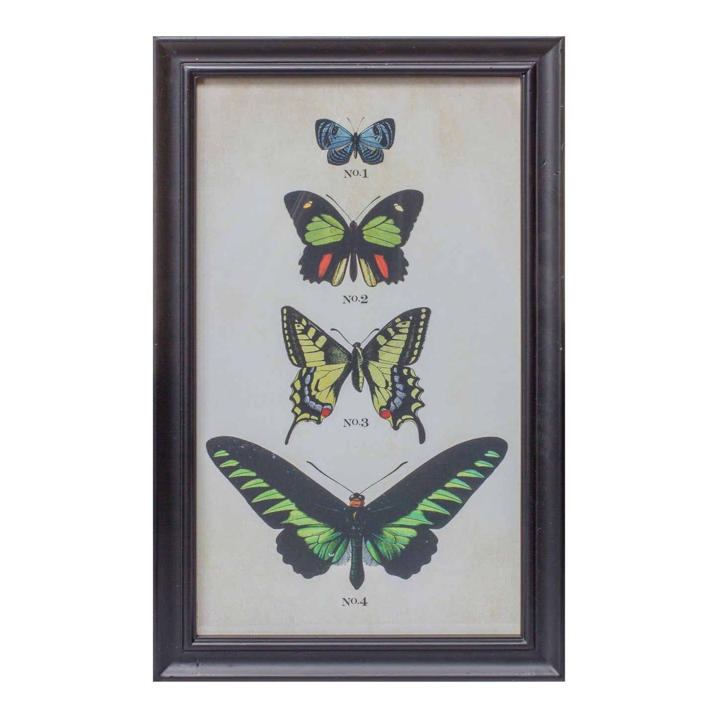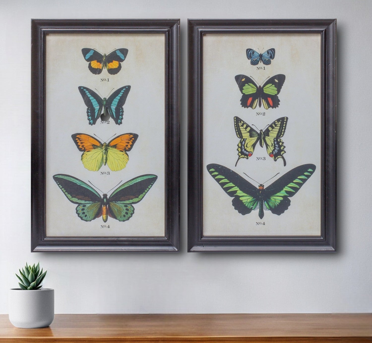 Unique and decorative, this set of two 18-inch x 11-inch black blue and green butterfly solid wood framed art will leave a lasting impression. Instantly liven up your space with this art that brings color and dimension to your walls. Inspired by one of nature's most revered icons, this pretty butterfly inspired artwork will be a beautiful and special addition to your room's decor. This good looking decor will fill the empty space on your wall while adding a stylish and decorative touch. Utilize this opportunity to create a focal point in the room with this fabulous wall decor option. 18.25-inch h x 11.25-inch w x 0.75-inch d