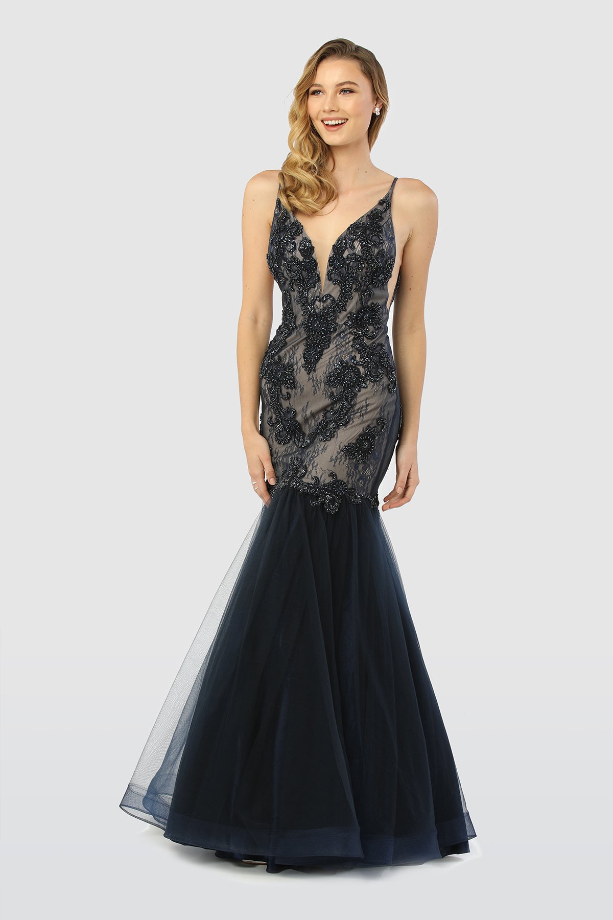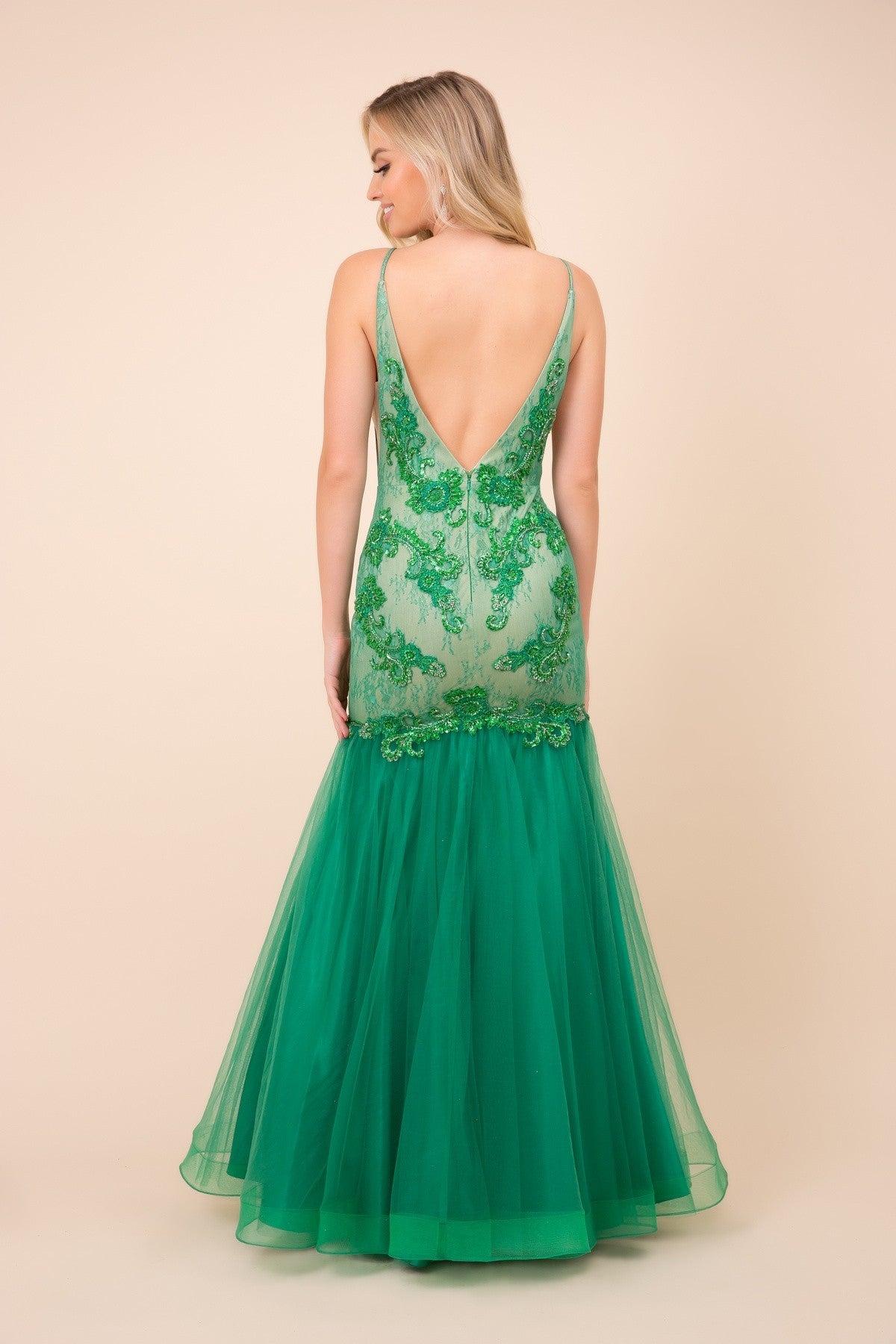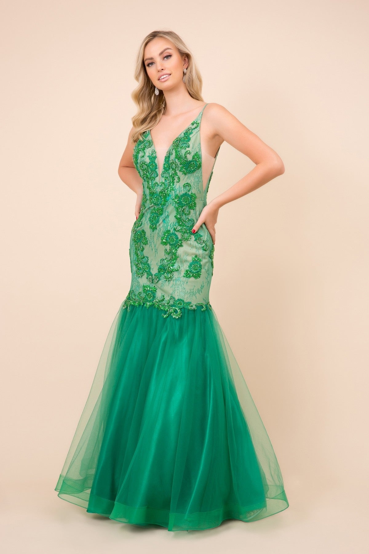 Light up the event and get noticed by everyone with a beaded mermaid skirt gown. This is for ladies who are looking simple and elegant gown. Features an exquisite deep v neckline in spaghetti straps gown. Love the stunning open sides that leads to deep v open back for more appeal. Showcasing mermaid skirt to highlight hourglass figure. Amazing beadwork is scattered all throughout the dress which is above the mesh material of the dress. Available in green and navy.