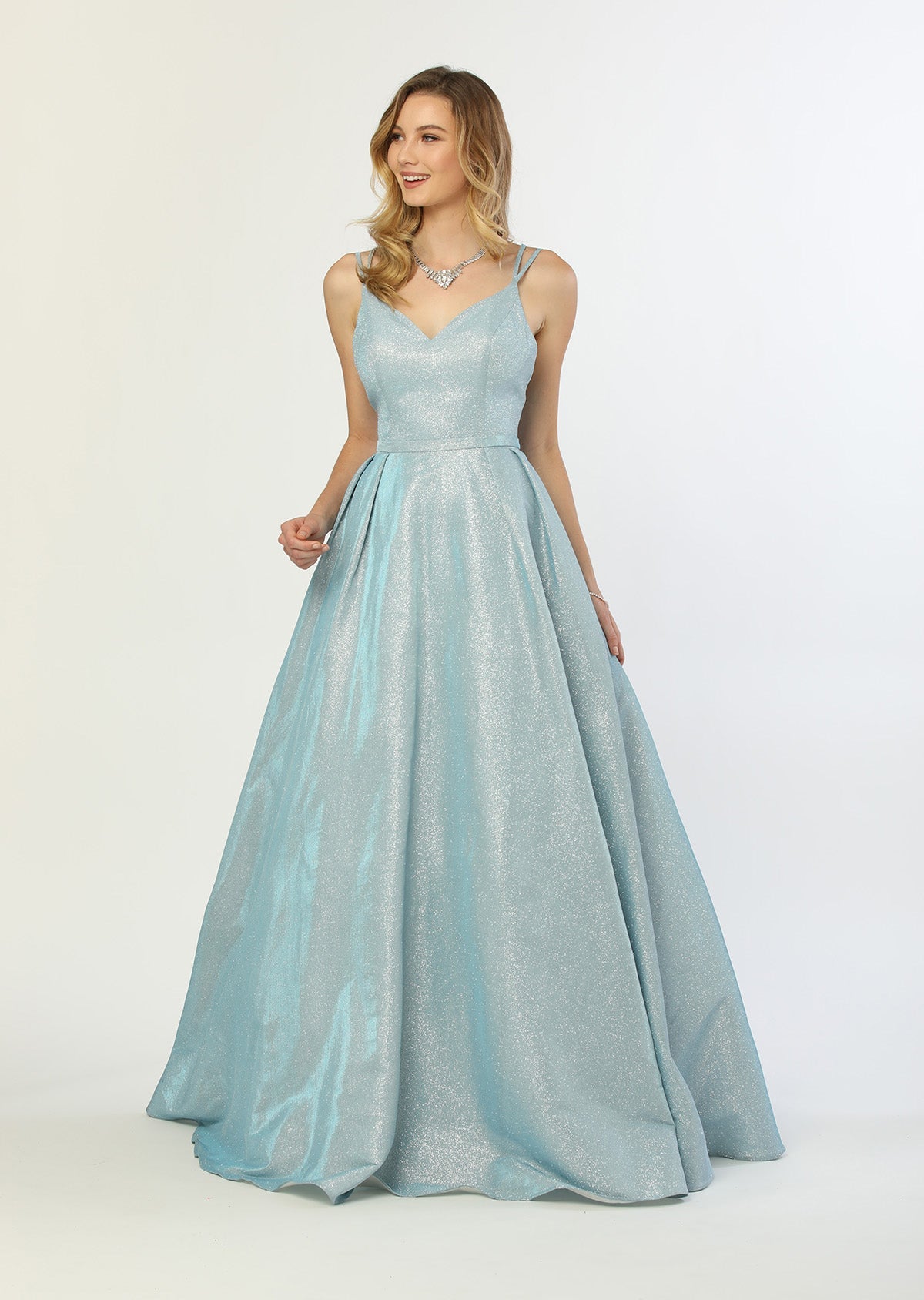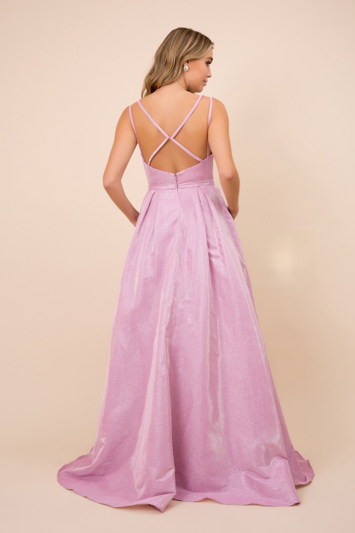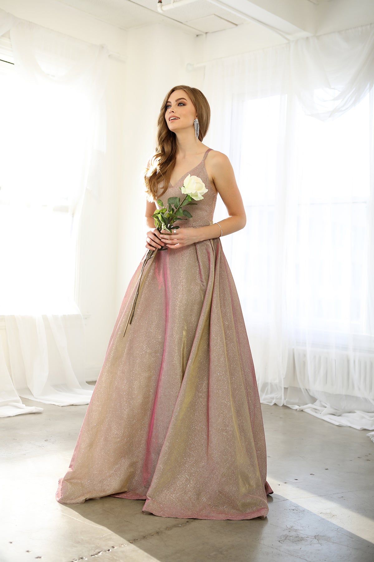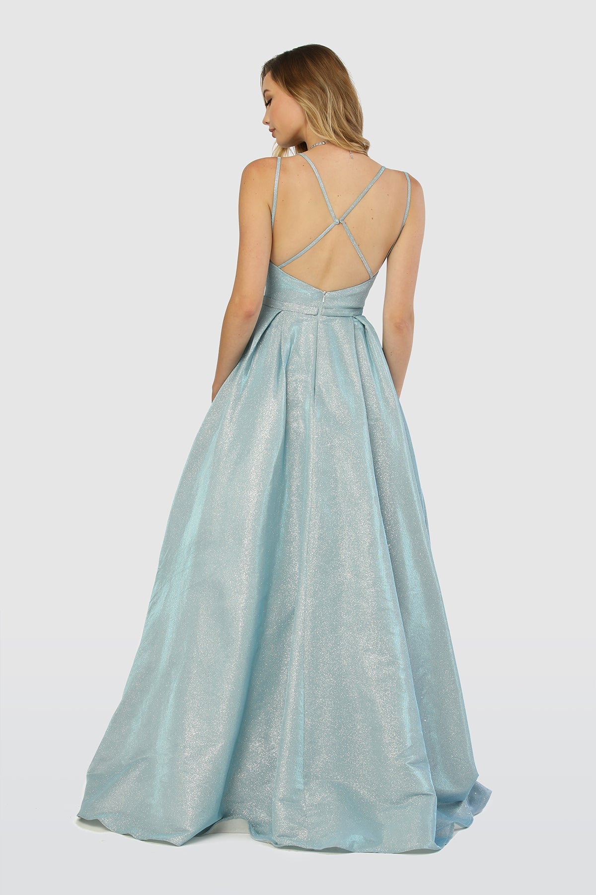 Keep it simple and classy sparkly full gown. Sleeveless fitted bodice made from glitter material and showcases a figure-flattering fit. One of its features is a sweetheart v-neckline with a slight curve topped double spaghetti straps and belt to highlight the waist. The slim-fit bodice goes all the way to a full floor-length skirt. The open back with cross strings will captivate attention. Available in Hot Pink, Gold, Blue, and Rose Gold.