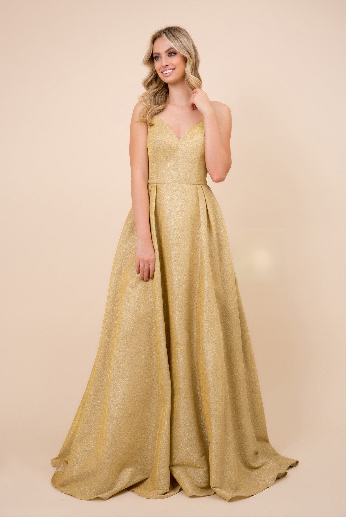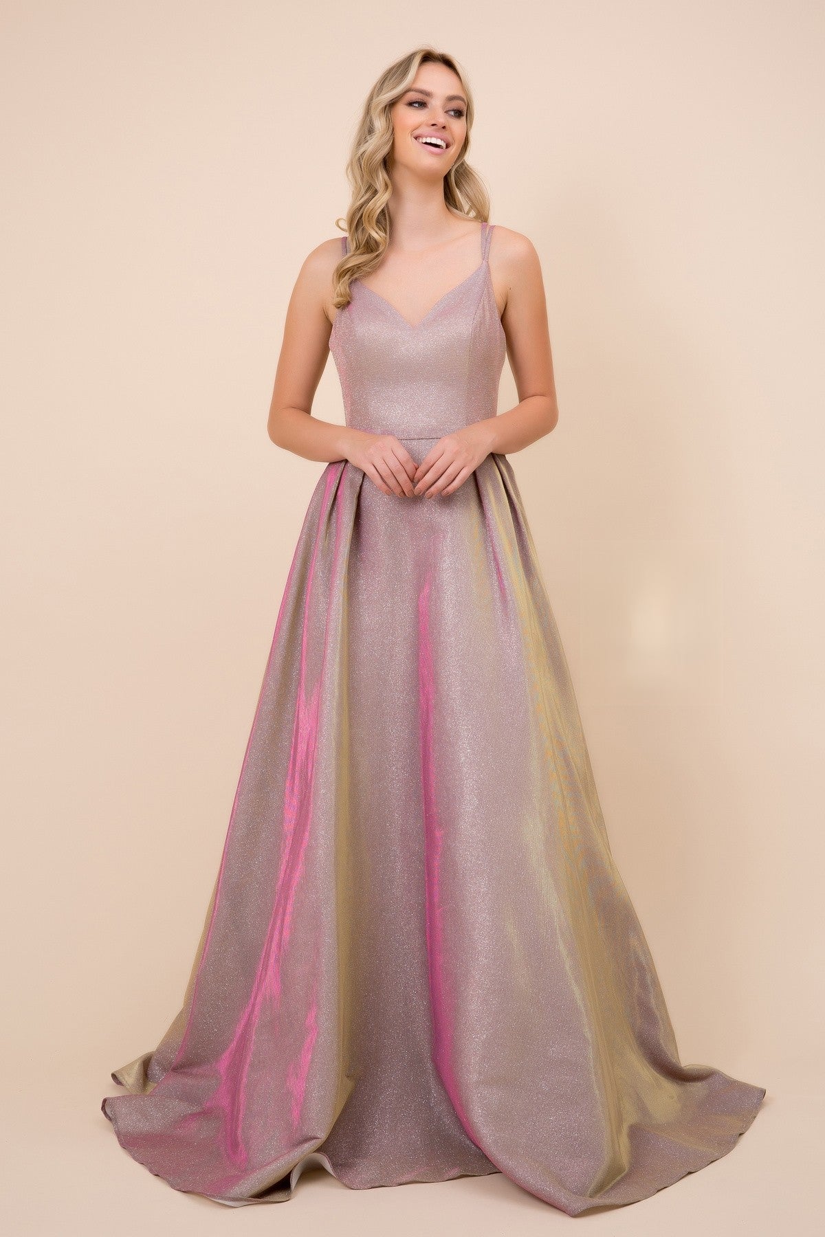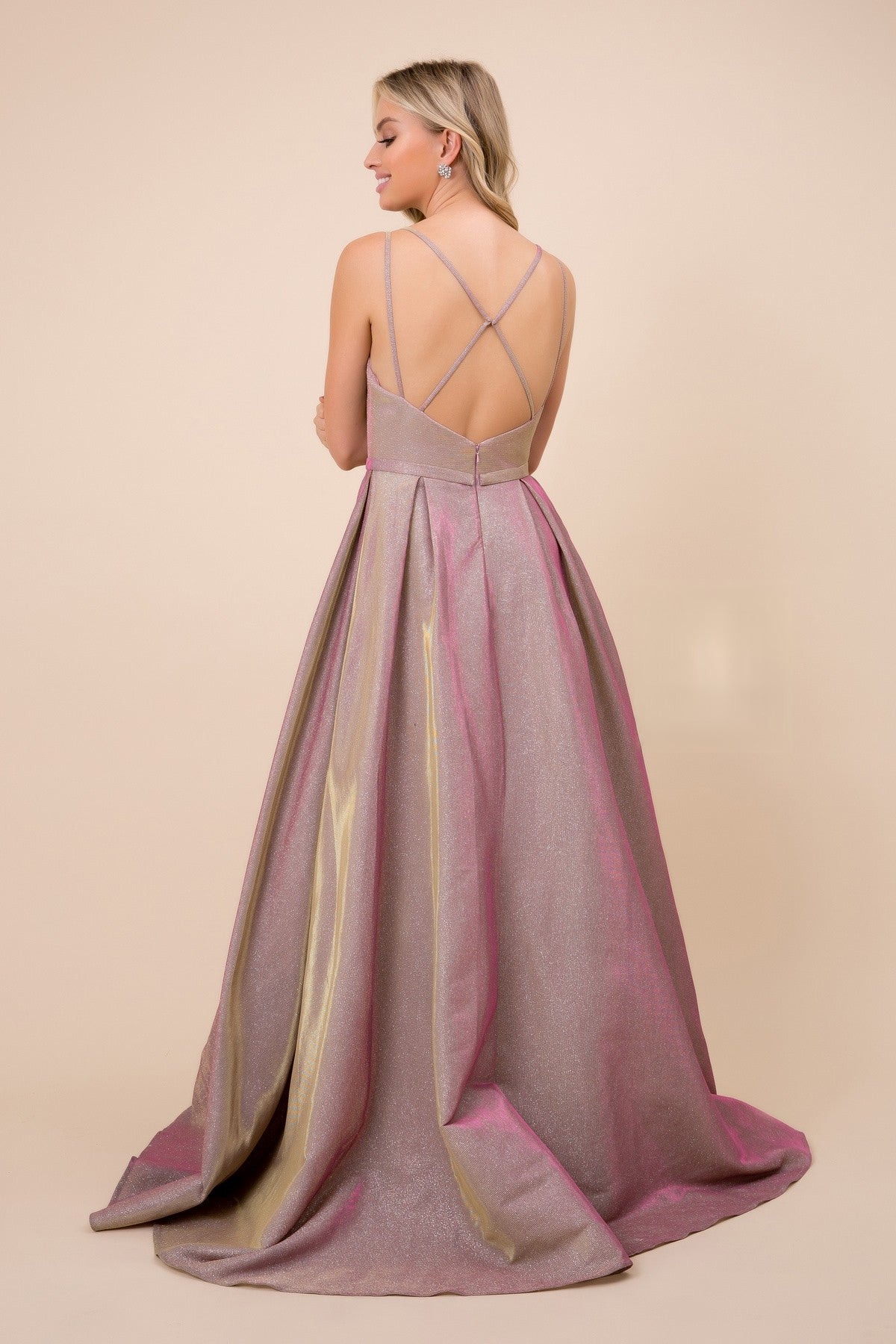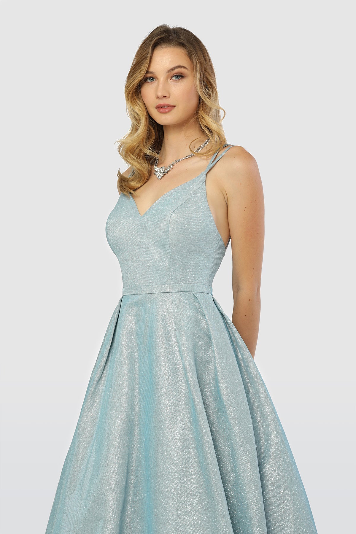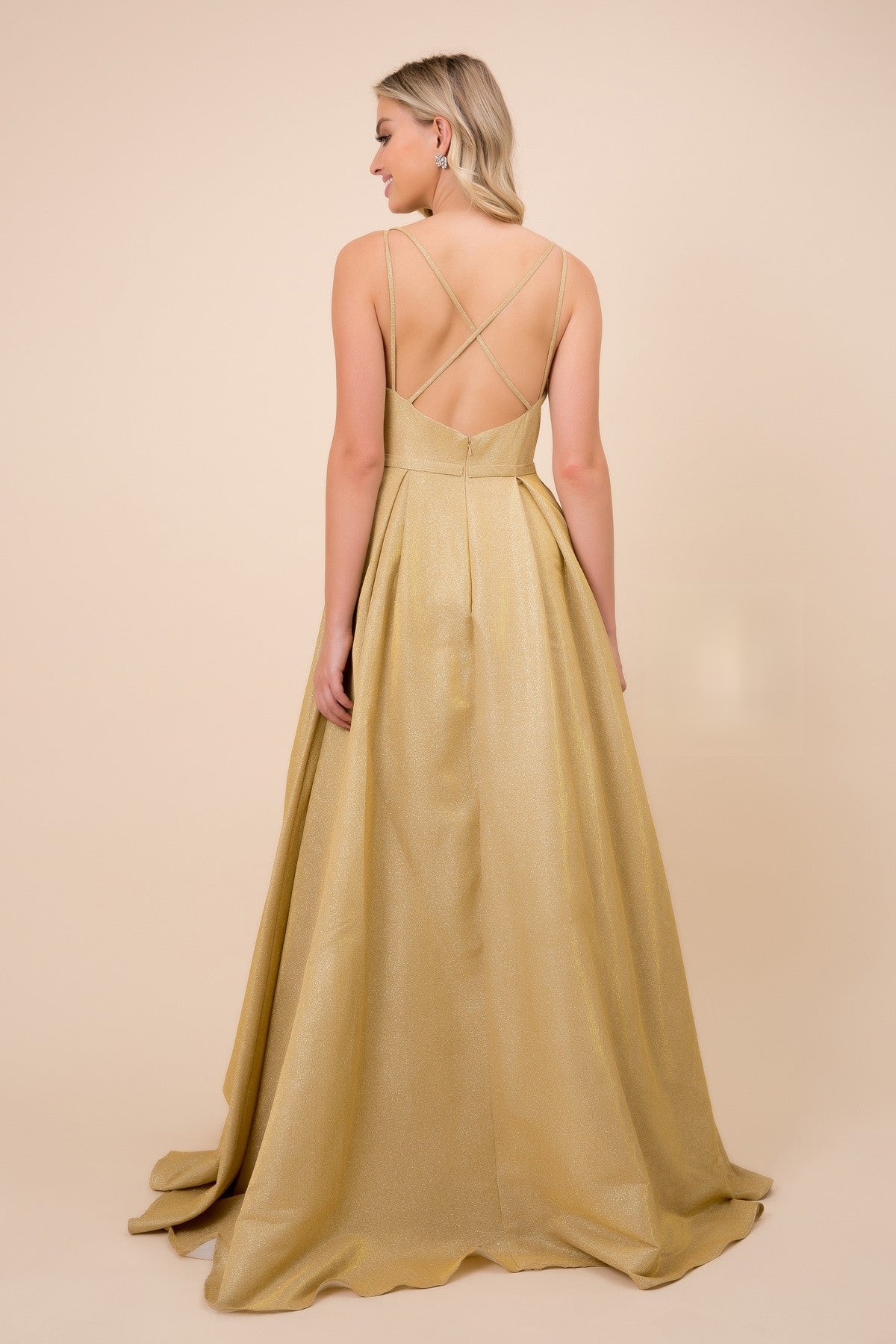 Keep it simple and classy sparkly full gown. Sleeveless fitted bodice made from glitter material and showcases a figure-flattering fit. One of its features is a sweetheart v-neckline with a slight curve topped double spaghetti straps and belt to highlight the waist. The slim-fit bodice goes all the way to a full floor-length skirt. The open back with cross strings will captivate attention. Available in Hot Pink, Gold, Blue, and Rose Gold.