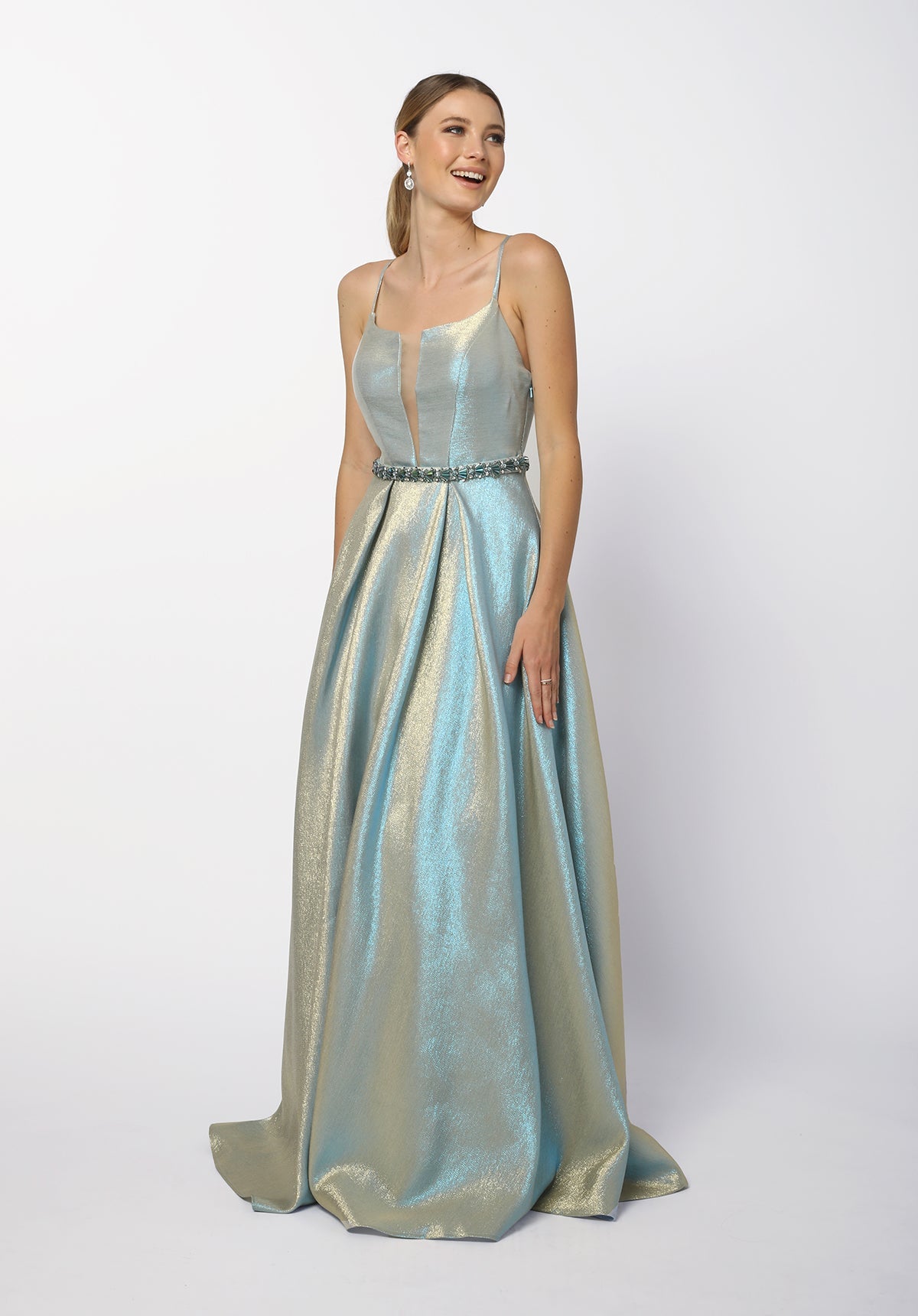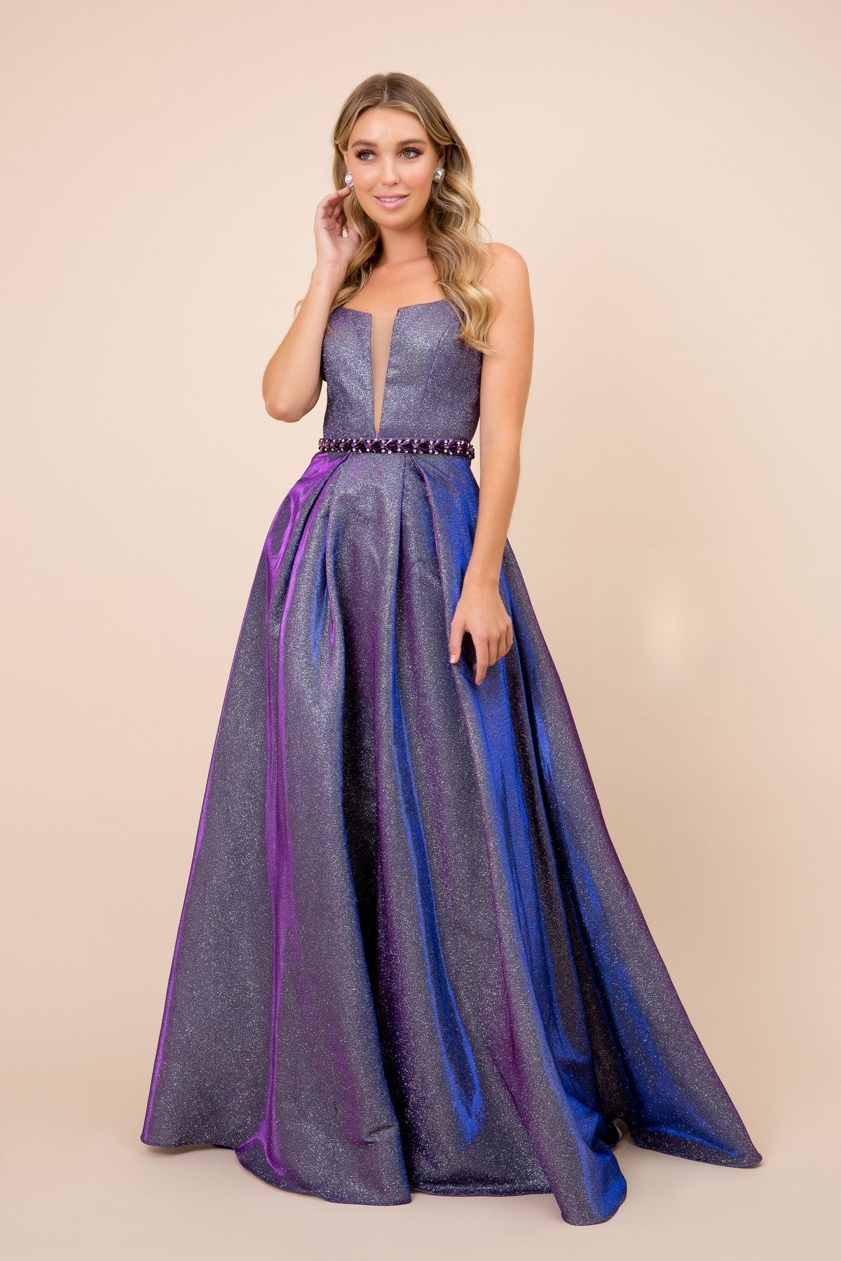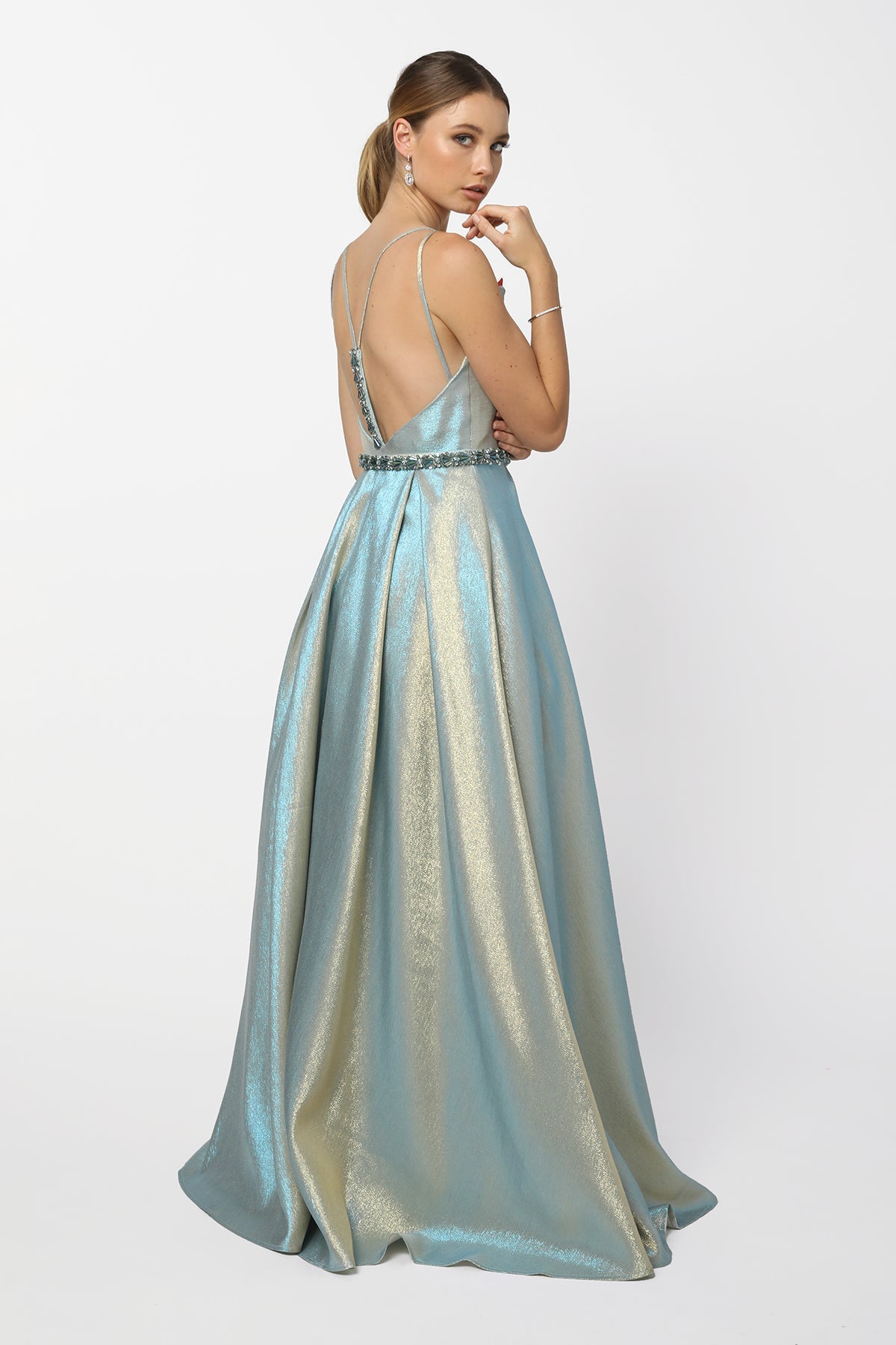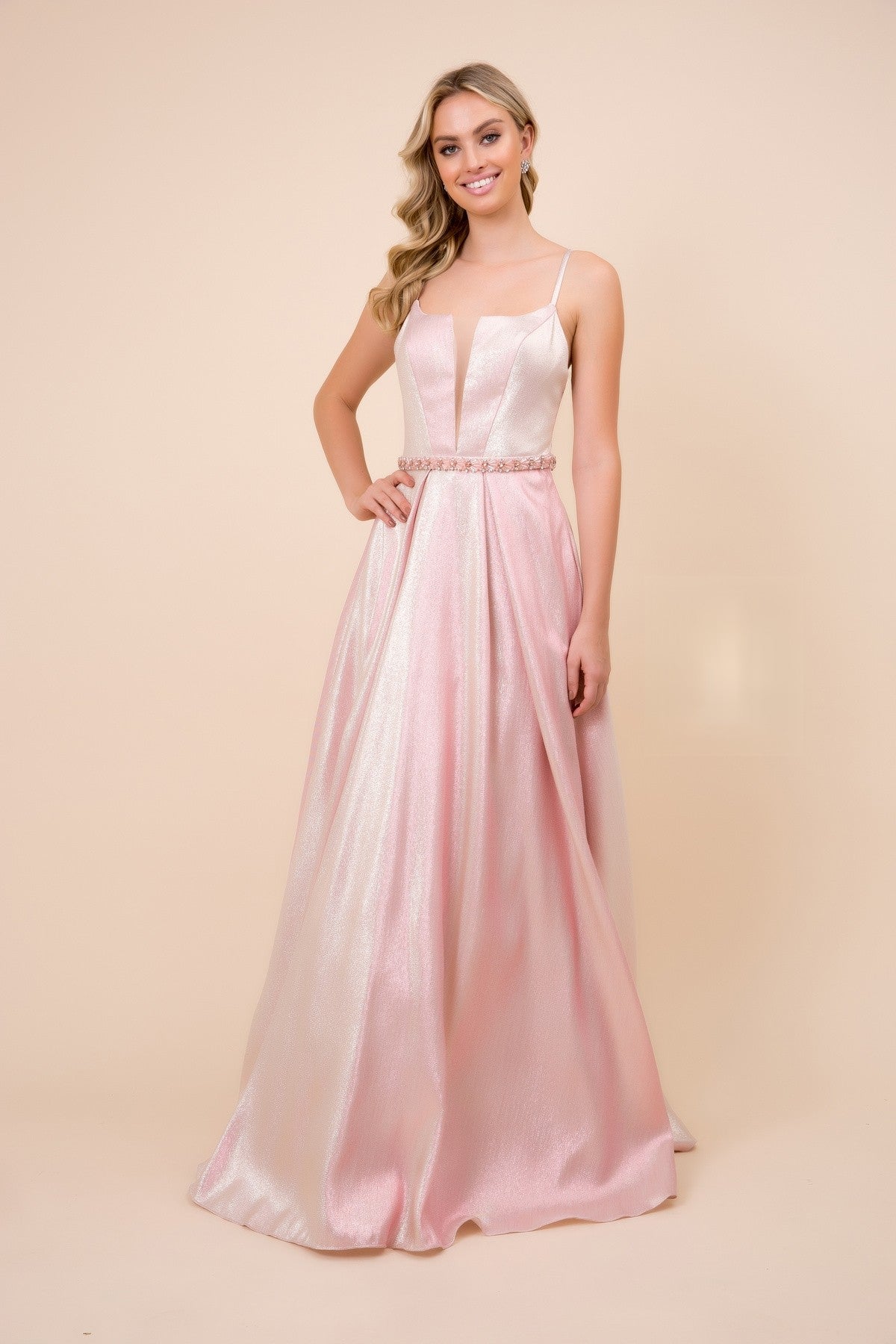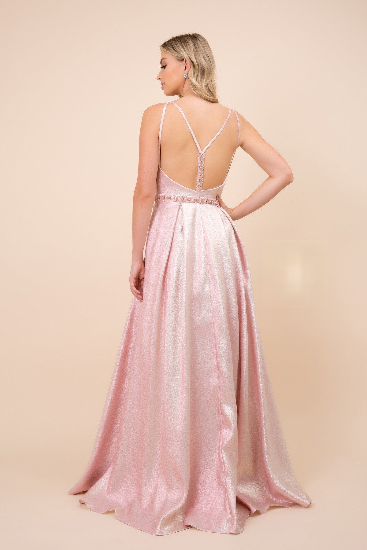 This beautiful square neck plunge v pleated shinny A-line gown by SMC Fashion creates a fairytale look at any event. This dress features spaghetti straps on a square neck with a skinny plunge, v pleated on the front of the gown. Beaded belt on waistline sculpturing the figure. this flawless troupe is delegated at the stand-by with shining gems. The extravagant A-line skirt flares gloriously down to the floor with a starlight bid, low open back with zipper closure creates a perfectly fitted gown.
