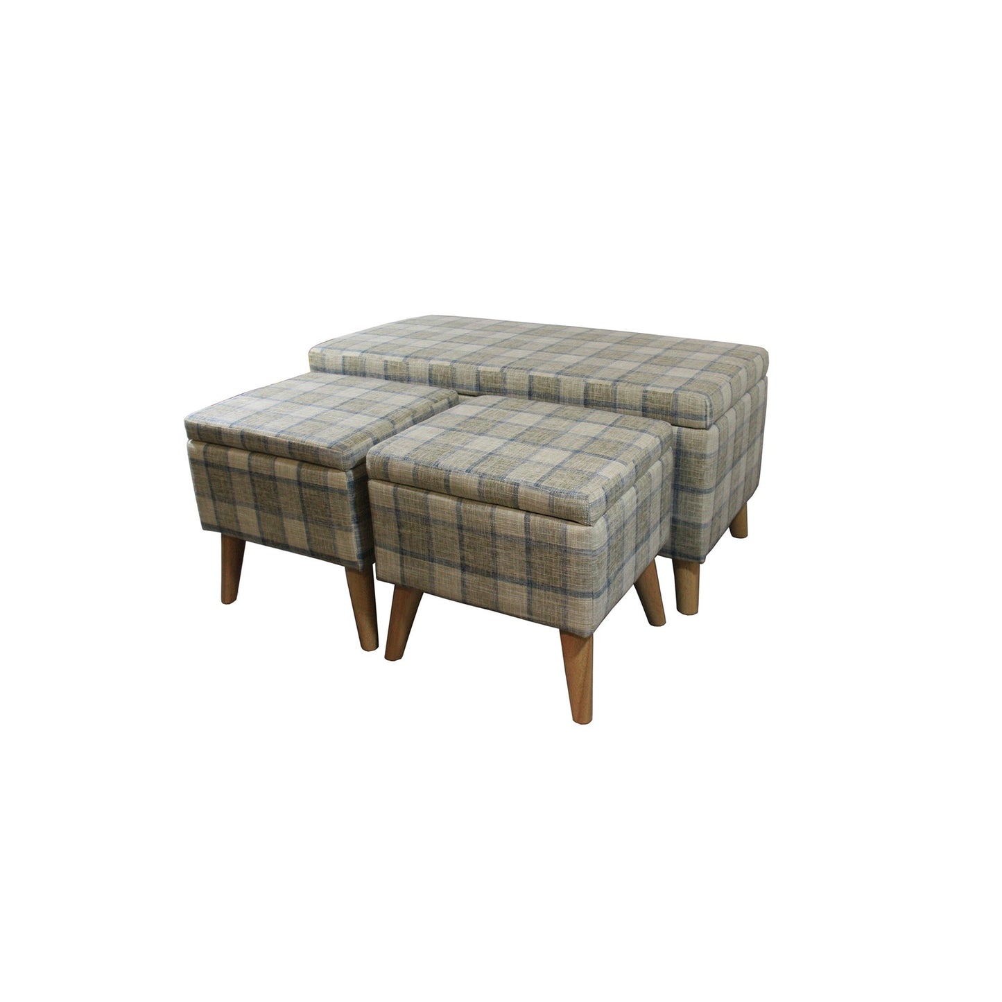 Designed for extra storage room and functionality the Taupe and Blue Plaid Storage Bench and Ottoman Three Piece Set is a good looking and practical set for living rooms or lounges. This stylish set will adds function and lots of seating to your space. It features one large and two small ottomans with a built-in storage compartment. The high-density polyfoam seat will provide optimal comfort and support, and the upholstery is finished with a casually elegant plaid fabric. Perfect for adding extra seating space for guests. The slanted wooden legs are just a finishing touch of traditional elegance. 18" H x 36" W x 18" D