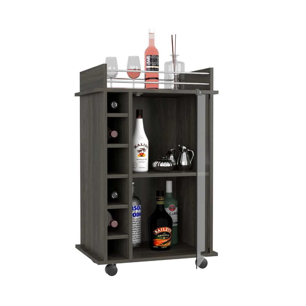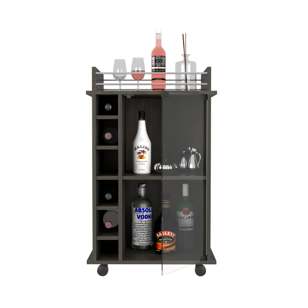 The Baltimore Bar Cart brings mobility and functionality together. The open-top shelf is perfect for preparing and serving cocktails during a party or showcasing decor any other day of the week. It provides you with the perfect storage option for all your bottles and glasses. the sleek modern styling and the mobility provided by the wheels with a locking mechanism are all the functionality you need. Featuring a beautiful glass door cabinet with two interior shelves, includes six liquor bottle cubbies, wheels with a Locking mechanism, spacious top surface with a metal rail, designed with Carbon Espresso manufactured wood.