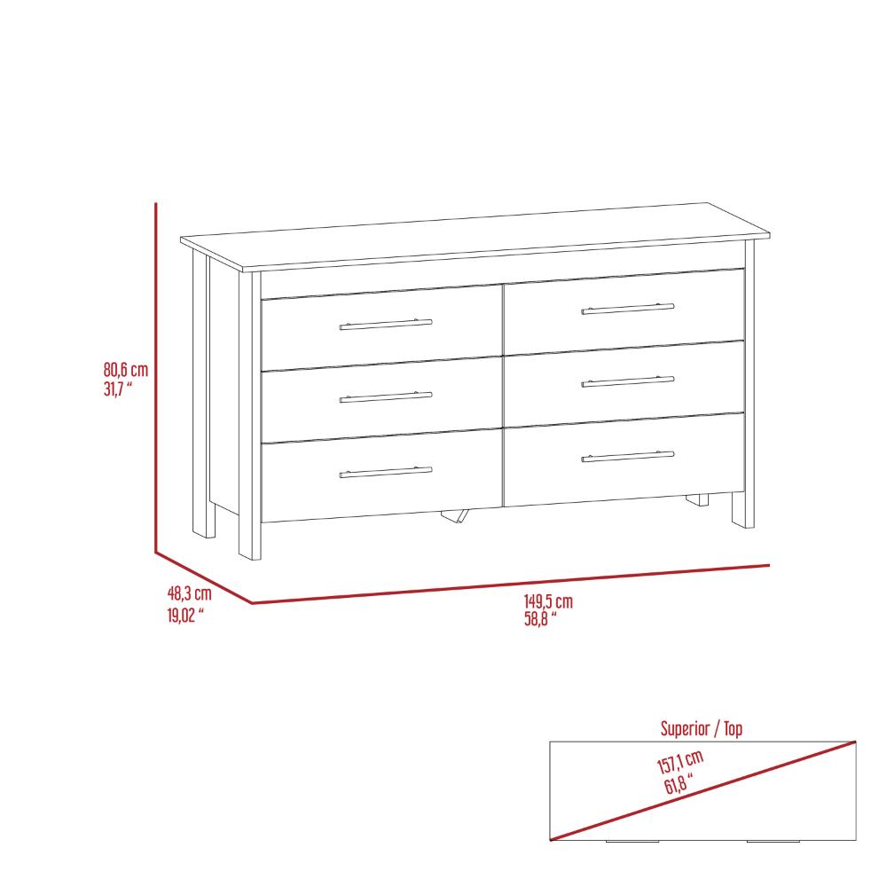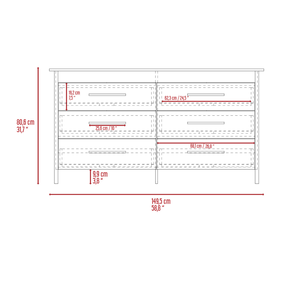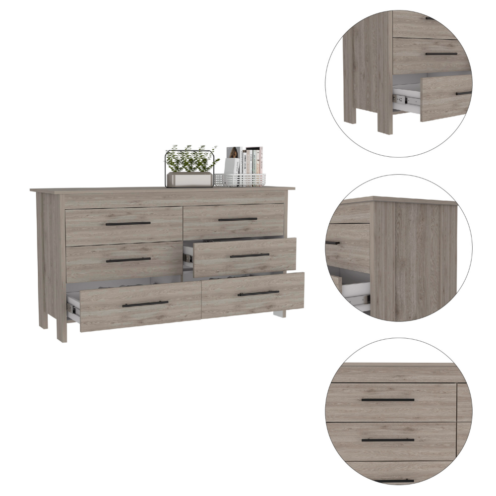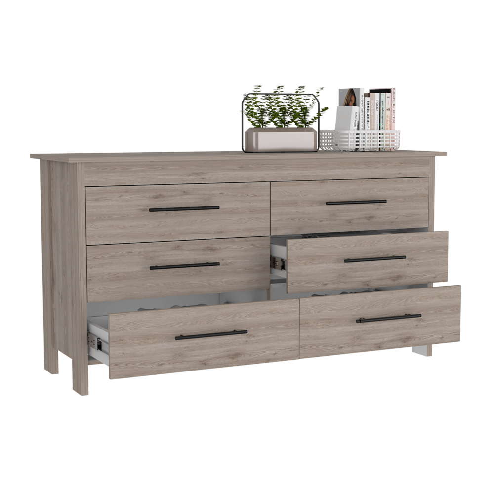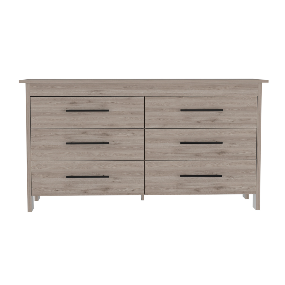 This clean-lined double dresser brings your bedroom or guest room into the 21st century by offering virtual storage space. Made in Colombia, this economic piece features six very spacious drawers (7.5" high x 26.8" wide) that will provide you with plenty of hidden space; each drawer comes with black metal pulls for a modern touch, roller glides, and all-metal hardware for smoother, longer-lasting drawer operation. A neutral finish gives this design the versatility to blend with any color palette you dream up. The top table (58W x 19" D) is perfect for placing decorative items or even a flat-screen TV. Designed with elegant light grey manufactured wood finish.